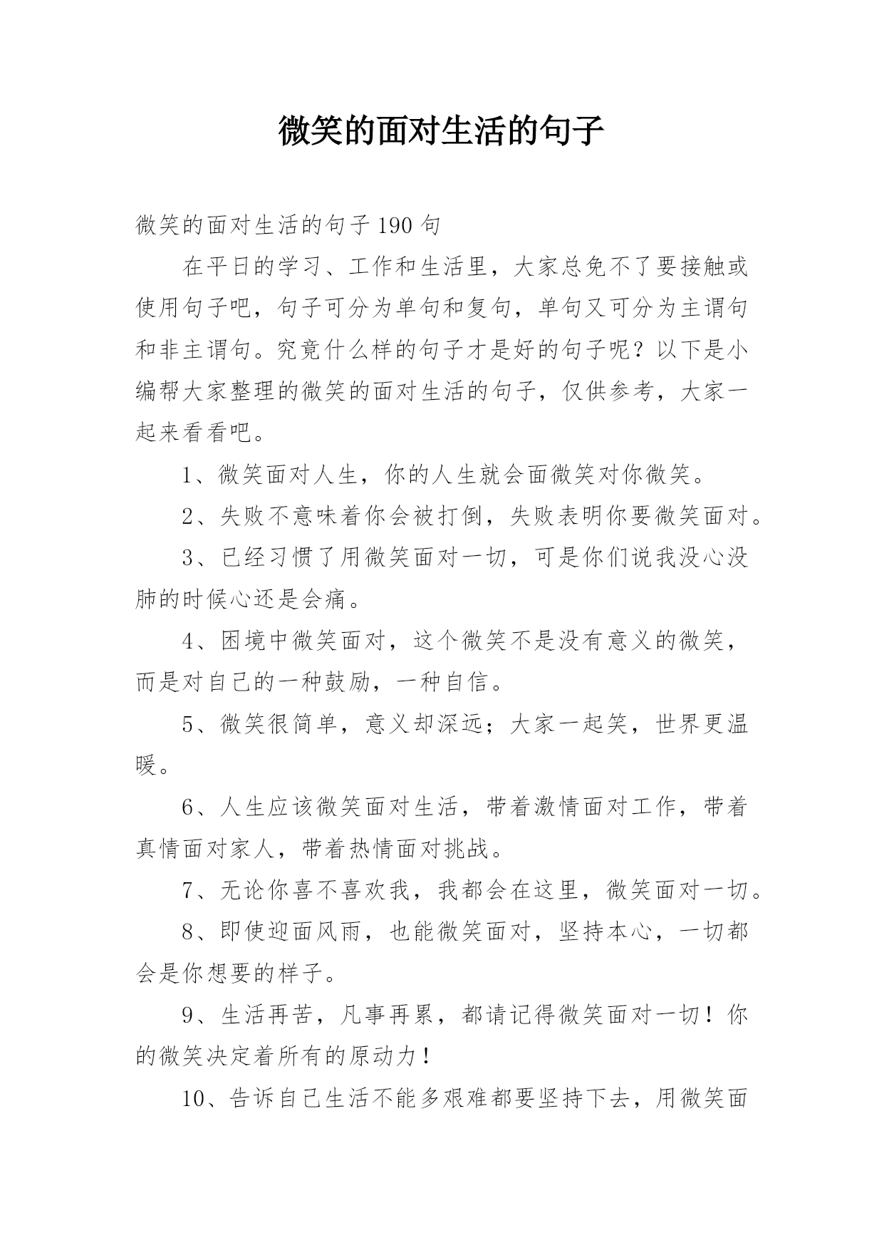 微笑的面对生活的句子微笑的面对生活的句子190句在平日的学习、工作和生活里,大家总免不了要接触或使用句子吧,句子可分为单句和复句,单句又可分为主谓句和非主谓句。究竟什么样的句子才是好的句子呢?以下是小编帮大家整理的微笑的面对生活的句子,仅供参考,大家一起来看看吧。1、微笑面对人生,你的人生就会面微笑对你微笑。2、失败不意味着你会被打倒,失败表明你要微笑面对。3、已经习惯了用微笑面对一切,可是你们说我没心没肺的时候心还是会痛。4、困境中微笑面对,这个微笑不是没有意义的微笑,而是对自己的一种鼓励,一种自信。5