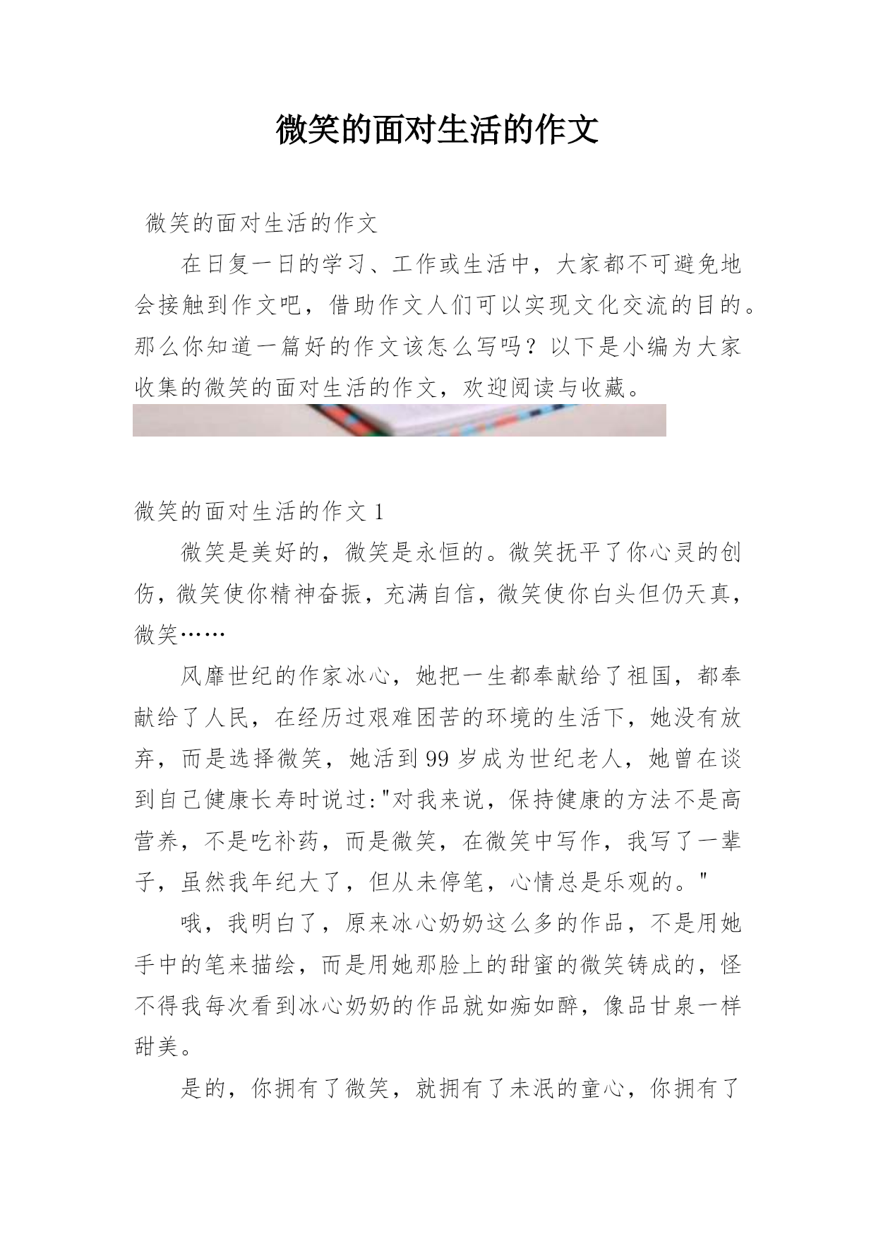 微笑的面对生活的作文微笑的面对生活的作文在日复一日的学习、工作或生活中,大家都不可避免地会接触到作文吧,借助作文人们可以实现文化交流的目的。那么你知道一篇好的作文该怎么写吗?以下是小编为大家收集的微笑的面对生活的作文,欢迎阅读与收藏。微笑的面对生活的作文1微笑是美好的,微笑是永恒的。微笑抚平了你心灵的创伤,微笑使你精神奋振,充满自信,微笑使你白头但仍天真,微笑……风靡世纪的作家冰心,她把一生都奉献给了祖国,都奉献给了人民,在经历过艰难困苦的环境的生活下,她没有放弃,而是选择微笑,她活到99岁成为世纪老人,