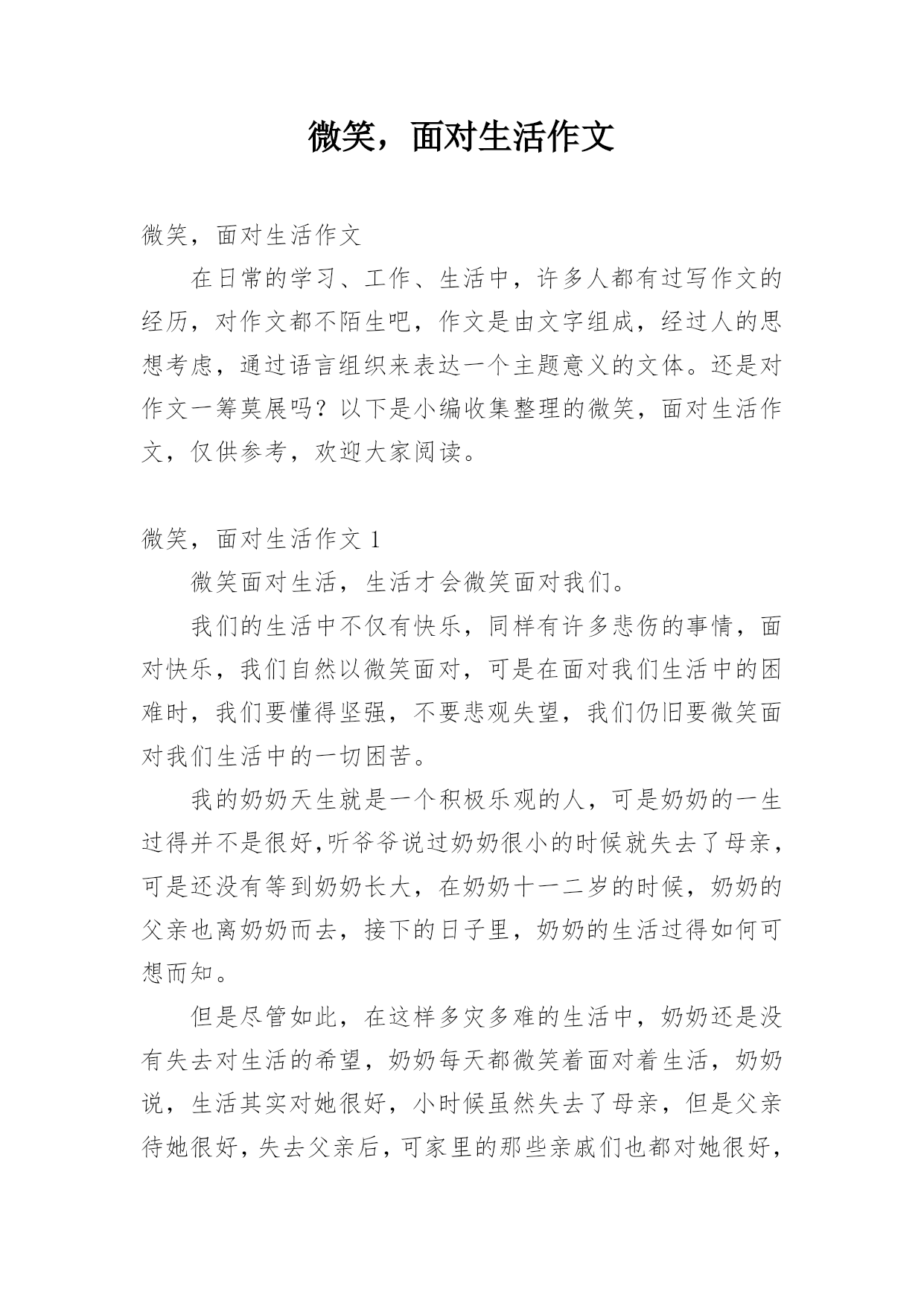 微笑,面对生活作文微笑,面对生活作文在日常的学习、工作、生活中,许多人都有过写作文的经历,对作文都不陌生吧,作文是由文字组成,经过人的思想考虑,通过语言组织来表达一个主题意义的文体。还是对作文一筹莫展吗?以下是小编收集整理的微笑,面对生活作文,仅供参考,欢迎大家阅读。微笑,面对生活作文1微笑面对生活,生活才会微笑面对我们。我们的生活中不仅有快乐,同样有许多悲伤的事情,面对快乐,我们自然以微笑面对,可是在面对我们生活中的困难时,我们要懂得坚强,不要悲观失望,我们仍旧要微笑面对我们生活中的一切困苦。我的奶奶天