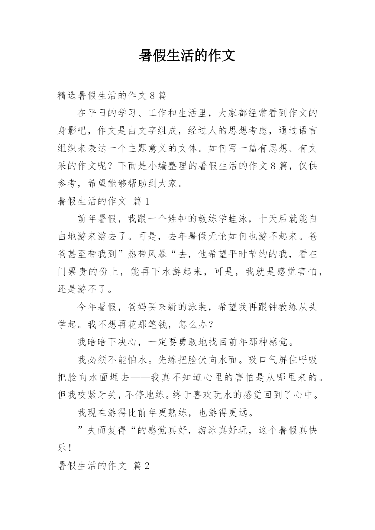 暑假生活的作文精选暑假生活的作文8篇在平日的学习、工作和生活里,大家都经常看到作文的身影吧,作文是由文字组成,经过人的思想考虑,通过语言组织来表达一个主题意义的文体。如何写一篇有思想、有文采的作文呢?下面是小编整理的暑假生活的作文8篇,仅供参考,希望能够帮助到大家。暑假生活的作文篇1前年暑假,我跟一个姓钟的教练学蛙泳,十天后就能自由地游来游去了。可是,去年暑假无论如何也游不起来。爸爸甚至带我到”热带风暴“去,他希望平时节约的我,看在门票贵的份上,能再下水游起来,可是,我就是感觉害怕,还是游不了。今年暑假,