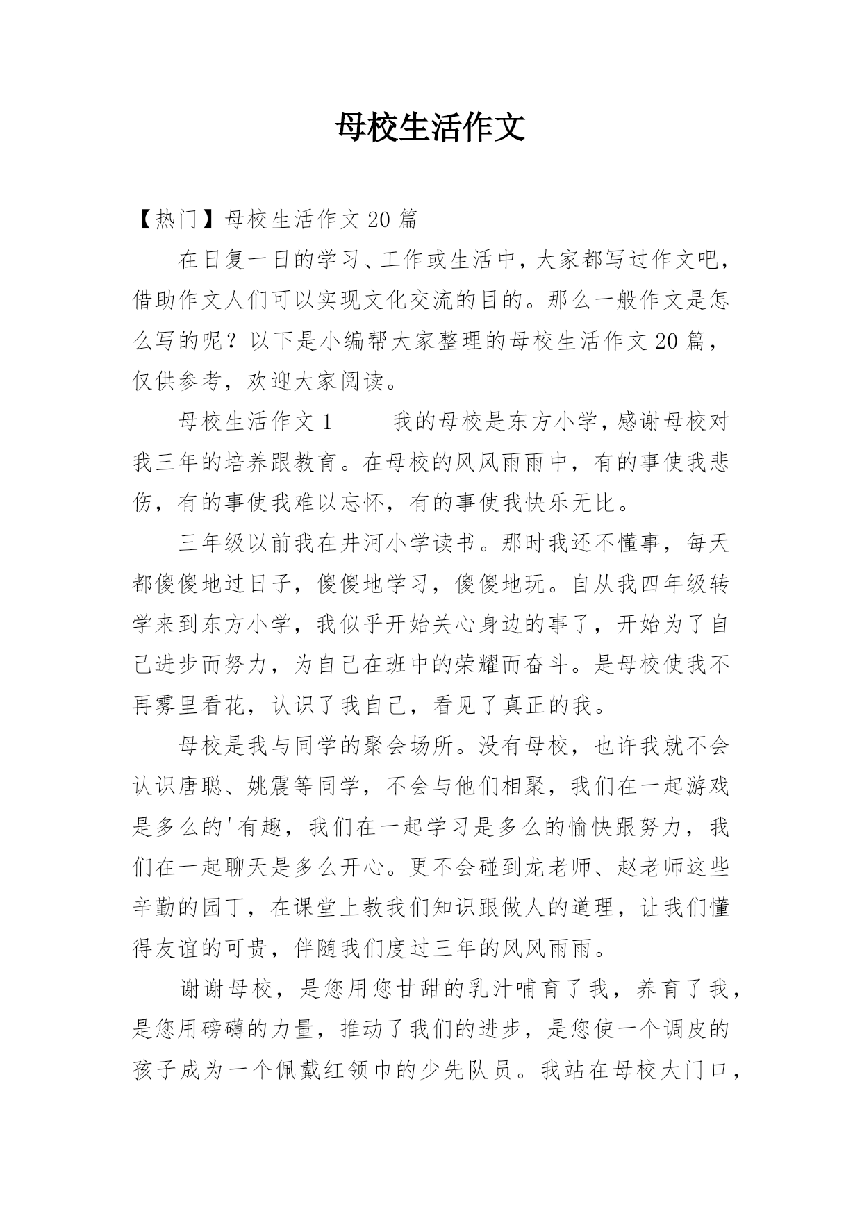 母校生活作文【热门】母校生活作文20篇在日复一日的学习、工作或生活中,大家都写过作文吧,借助作文人们可以实现文化交流的目的。那么一般作文是怎么写的呢?以下是小编帮大家整理的母校生活作文20篇,仅供参考,欢迎大家阅读。母校生活作文1我的母校是东方小学,感谢母校对我三年的培养跟教育。在母校的风风雨雨中,有的事使我悲伤,有的事使我难以忘怀,有的事使我快乐无比。三年级以前我在井河小学读书。那时我还不懂事,每天都傻傻地过日子,傻傻地学习,傻傻地玩。自从我四年级转学来到东方小学,我似乎开始关心身边的事了,开始为了自己