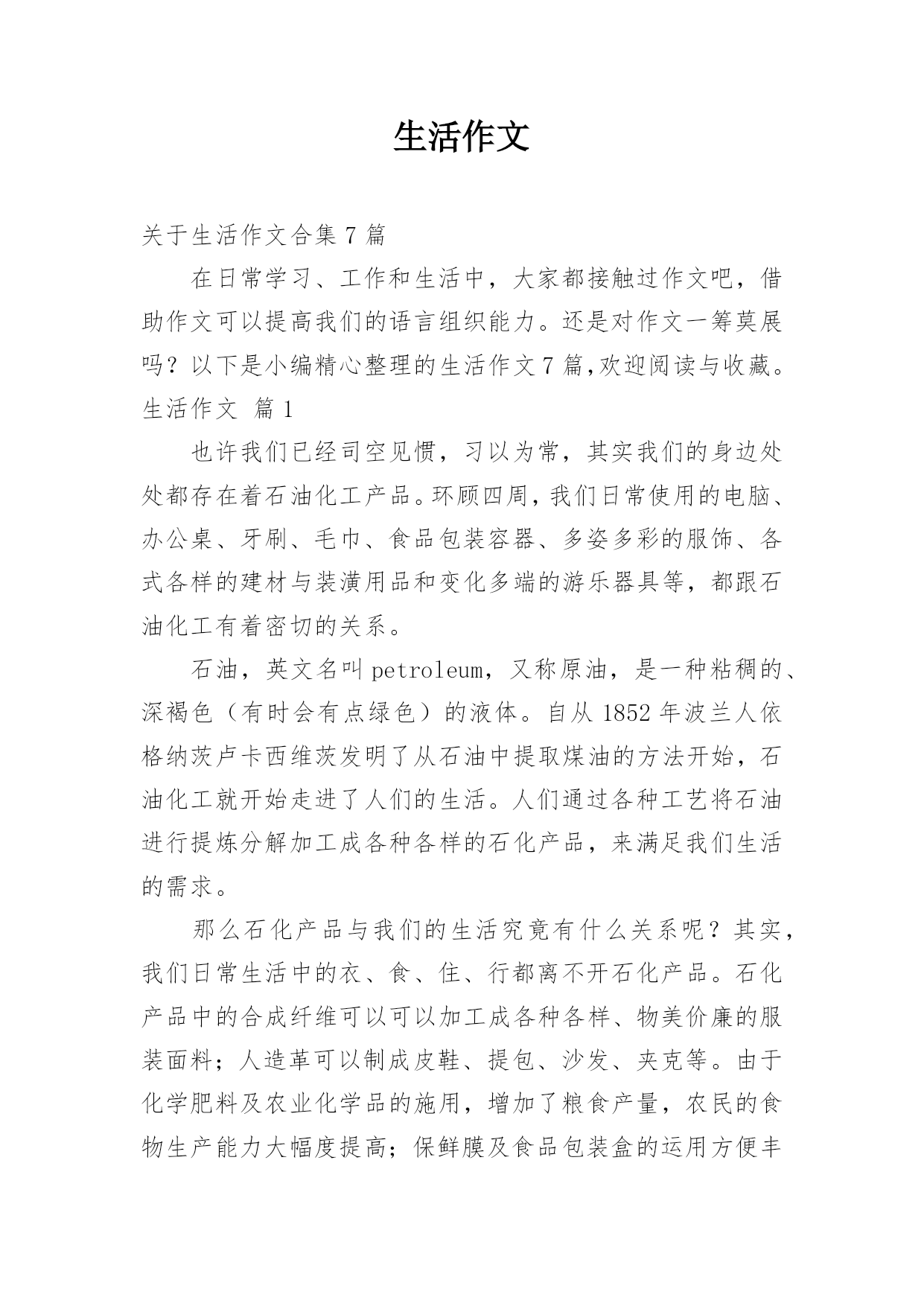 生活作文关于生活作文合集7篇在日常学习、工作和生活中,大家都接触过作文吧,借助作文可以提高我们的语言组织能力。还是对作文一筹莫展吗?以下是小编精心整理的生活作文7篇,欢迎阅读与收藏。生活作文篇1也许我们已经司空见惯,习以为常,其实我们的身边处处都存在着石油化工产品。环顾四周,我们日常使用的电脑、办公桌、牙刷、毛巾、食品包装容器、多姿多彩的服饰、各式各样的建材与装潢用品和变化多端的游乐器具等,都跟石油化工有着密切的关系。石油,英文名叫petroleum,又称原油,是一种粘稠的、深褐色(有时会有点绿色)的液体