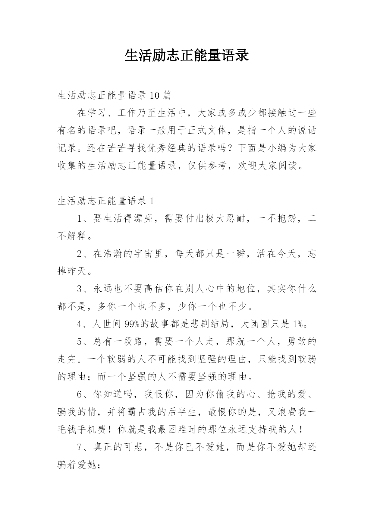 生活励志正能量语录生活励志正能量语录10篇在学习、工作乃至生活中,大家或多或少都接触过一些有名的语录吧,语录一般用于正式文体,是指一个人的说话记录。还在苦苦寻找优秀经典的语录吗?下面是小编为大家收集的生活励志正能量语录,仅供参考,欢迎大家阅读。生活励志正能量语录11、要生活得漂亮,需要付出极大忍耐,一不抱怨,二不解释。2、在浩瀚的宇宙里,每天都只是一瞬,活在今天,忘掉昨天。3、永远也不要高估你在别人心中的地位,其实你什么都不是,多你一个也不多,少你一个也不少。4、人世间99%的故事都是悲剧结局,大团圆只是