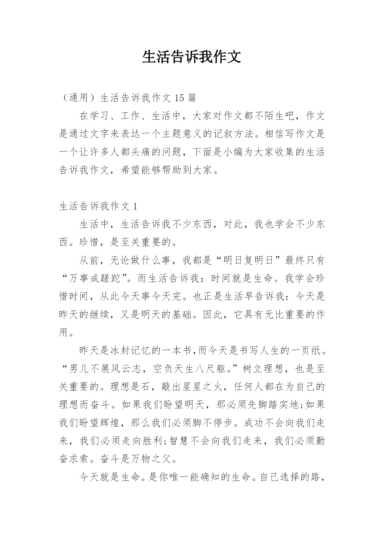 生活告诉我作文(通用)生活告诉我作文15篇在学习、工作、生活中,大家对作文都不陌生吧,作文是通过文字来表达一个主题意义的记叙方法。相信写作文是一个让许多人都头痛的问题,下面是小编为大家收集的生活告诉我作文,希望能够帮助到大家。生活告诉我作文1生活中,生活告诉我不少东西,对此,我也学会不少东西。珍惜,是至关重要的。从前,无论做什么事,我都是“明日复明日”最终只有“万事成蹉跎”。而生活告诉我:时间就是生命。我学会珍惜时间,从此今天事今天完。也正是生活早告诉我:今天是昨天的继续,又是明天的基础。因此,它具有无比