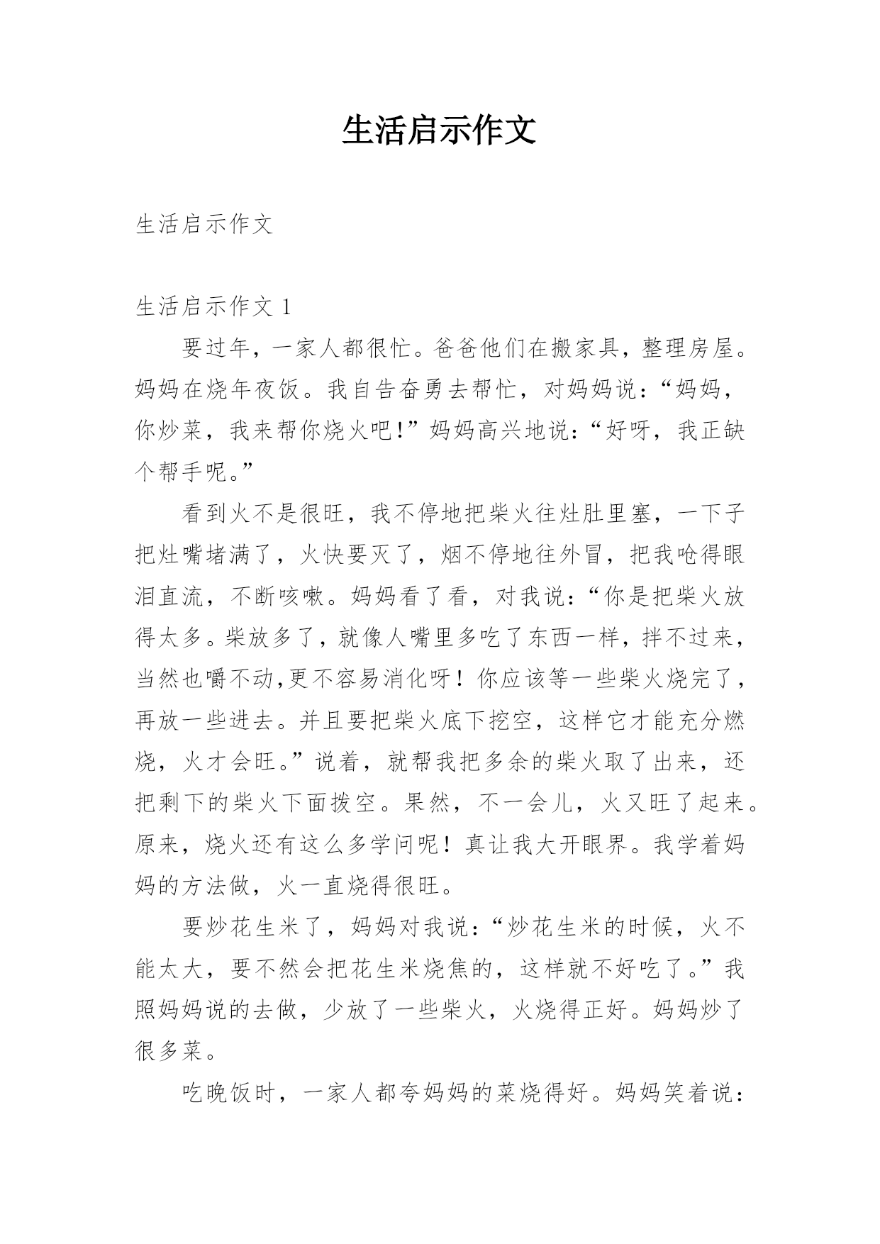 生活启示作文生活启示作文生活启示作文1要过年,一家人都很忙。爸爸他们在搬家具,整理房屋。妈妈在烧年夜饭。我自告奋勇去帮忙,对妈妈说:“妈妈,你炒菜,我来帮你烧火吧!”妈妈高兴地说:“好呀,我正缺个帮手呢。”看到火不是很旺,我不停地把柴火往灶肚里塞,一下子把灶嘴堵满了,火快要灭了,烟不停地往外冒,把我呛得眼泪直流,不断咳嗽。妈妈看了看,对我说:“你是把柴火放得太多。柴放多了,就像人嘴里多吃了东西一样,拌不过来,当然也嚼不动,更不容易消化呀!你应该等一些柴火烧完了,再放一些进去。并且要把柴火底下挖空,这样它才