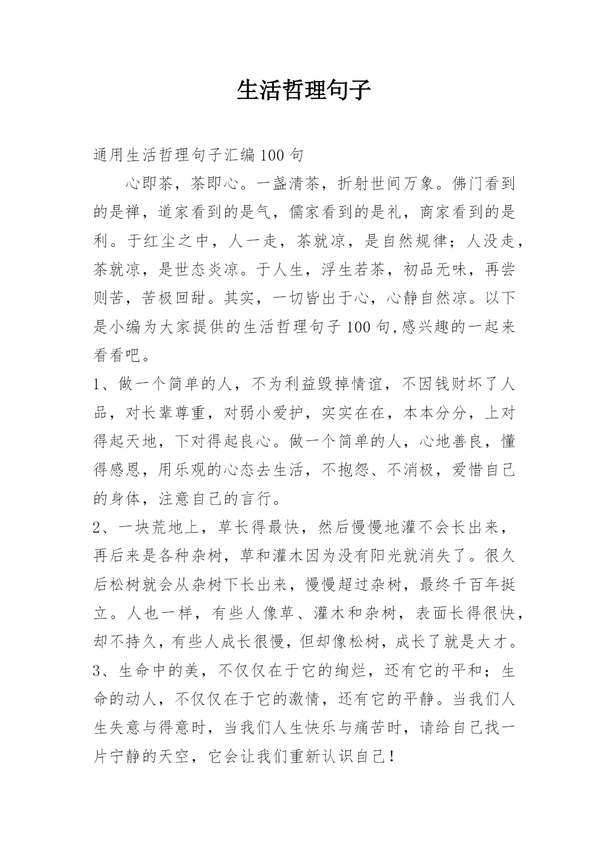 生活哲理句子通用生活哲理句子汇编100句心即茶,茶即心。一盏清茶,折射世间万象。佛门看到的是禅,道家看到的是气,儒家看到的是礼,商家看到的是利。于红尘之中,人一走,茶就凉,是自然规律;人没走,茶就凉,是世态炎凉。于人生,浮生若茶,初品无味,再尝则苦,苦极回甜。其实,一切皆出于心,心静自然凉。以下是小编为大家提供的生活哲理句子100句,感兴趣的一起来看看吧。1、做一个简单的人,不为利益毁掉情谊,不因钱财坏了人品,对长辈尊重,对弱小爱护,实实在在,本本分分,上对得起天地,下对得起良心。做一个简单的人,心地善良