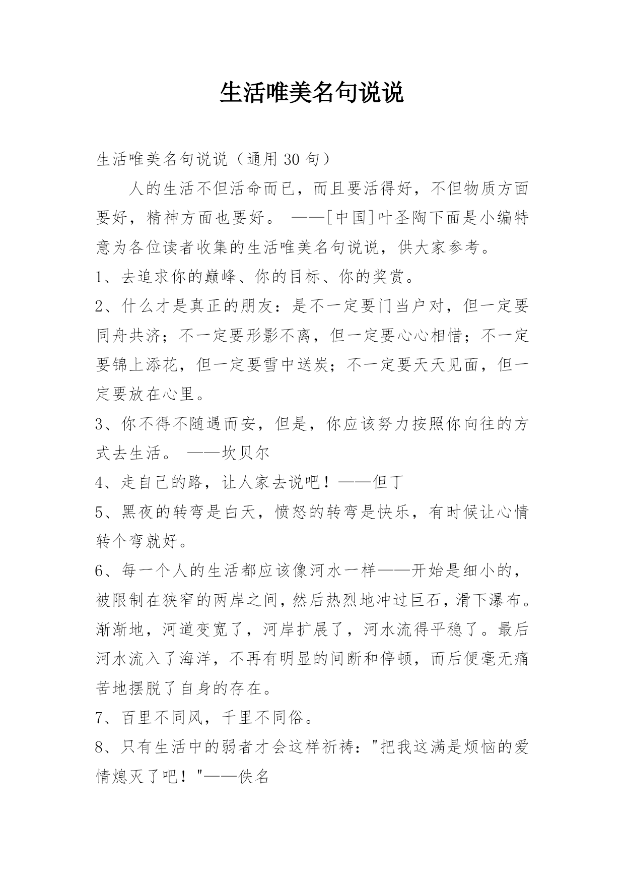 生活唯美名句说说生活唯美名句说说(通用30句)人的生活不但活命而已,而且要活得好,不但物质方面要好,精神方面也要好。——[中国]叶圣陶下面是小编特意为各位读者收集的生活唯美名句说说,供大家参考。1、去追求你的巅峰、你的目标、你的奖赏。2、什么才是真正的朋友:是不一定要门当户对,但一定要同舟共济;不一定要形影不离,但一定要心心相惜;不一定要锦上添花,但一定要雪中送炭;不一定要天天见面,但一定要放在心里。3、你不得不随遇而安,但是,你应该努力按照你向往的方式去生活。——坎贝尔4、走自己的路,让人家去说吧!——