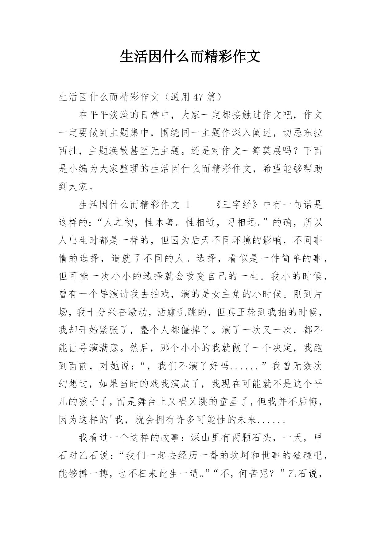 生活因什么而精彩作文生活因什么而精彩作文(通用47篇)在平平淡淡的日常中,大家一定都接触过作文吧,作文一定要做到主题集中,围绕同一主题作深入阐述,切忌东拉西扯,主题涣散甚至无主题。还是对作文一筹莫展吗?下面是小编为大家整理的生活因什么而精彩作文,希望能够帮助到大家。生活因什么而精彩作文1《三字经》中有一句话是这样的:“人之初,性本善。性相近,习相远。”的确,所以人出生时都是一样的,但因为后天不同环境的影响,不同事情的选择,造就了不同的人。选择,看似是一件简单的事,但可能一次小小的选择就会改变自己的一生。我