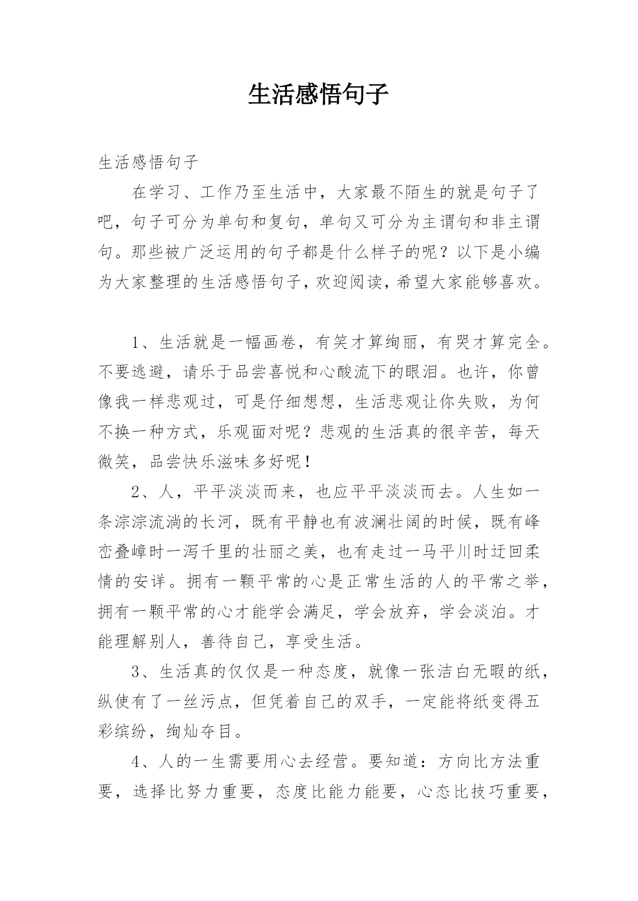 生活感悟句子生活感悟句子在学习、工作乃至生活中,大家最不陌生的就是句子了吧,句子可分为单句和复句,单句又可分为主谓句和非主谓句。那些被广泛运用的句子都是什么样子的呢?以下是小编为大家整理的生活感悟句子,欢迎阅读,希望大家能够喜欢。1、生活就是一幅画卷,有笑才算绚丽,有哭才算完全。不要逃避,请乐于品尝喜悦和心酸流下的眼泪。也许,你曾像我一样悲观过,可是仔细想想,生活悲观让你失败,为何不换一种方式,乐观面对呢?悲观的生活真的很辛苦,每天微笑,品尝快乐滋味多好呢!2、人,平平淡淡而来,也应平平淡淡而去。人生如一