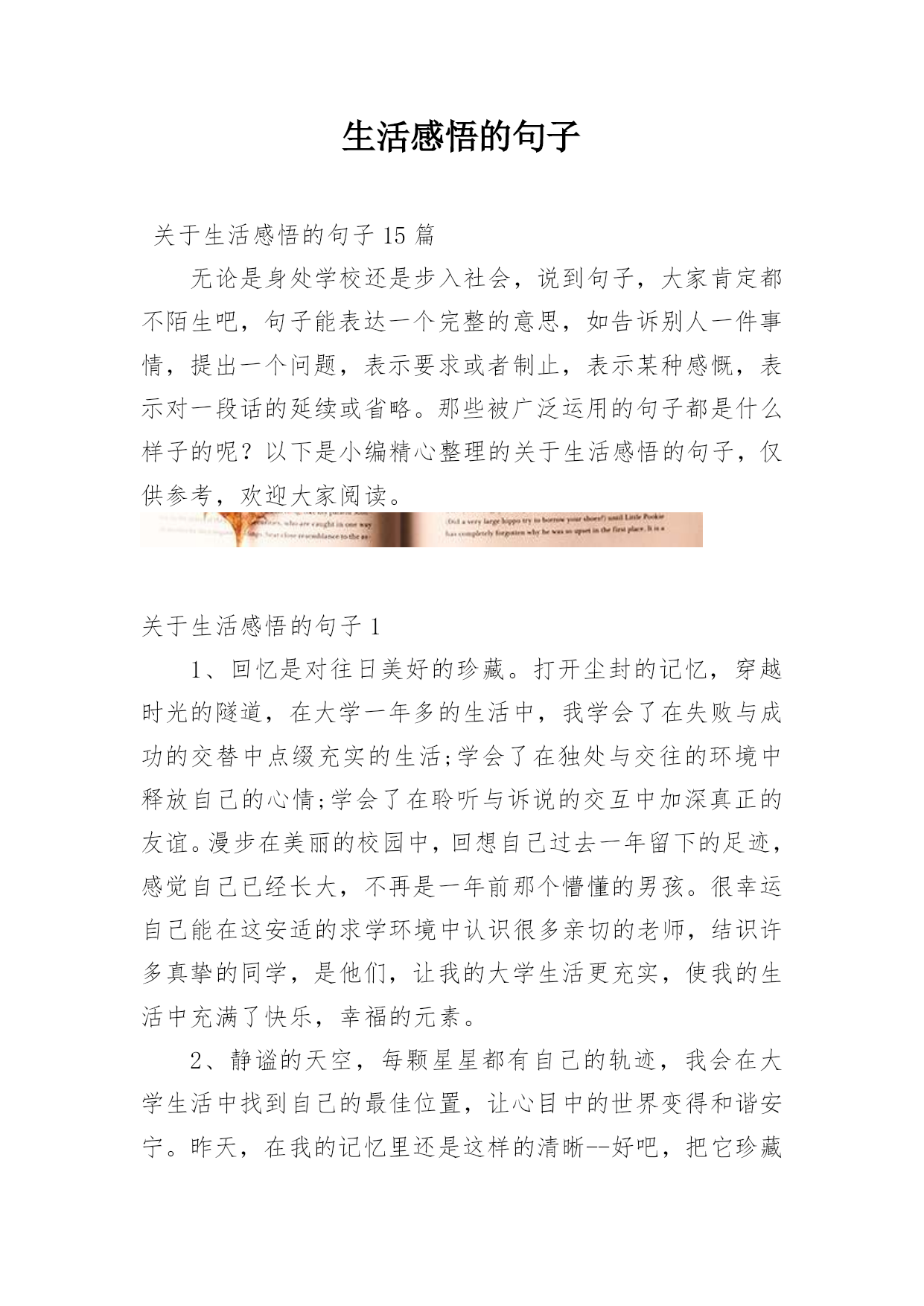 生活感悟的句子关于生活感悟的句子15篇无论是身处学校还是步入社会,说到句子,大家肯定都不陌生吧,句子能表达一个完整的意思,如告诉别人一件事情,提出一个问题,表示要求或者制止,表示某种感慨,表示对一段话的延续或省略。那些被广泛运用的句子都是什么样子的呢?以下是小编精心整理的关于生活感悟的句子,仅供参考,欢迎大家阅读。关于生活感悟的句子11、回忆是对往日美好的珍藏。打开尘封的记忆,穿越时光的隧道,在大学一年多的生活中,我学会了在失败与成功的交替中点缀充实的生活;学会了在独处与交往的环境中释放自己的心情;学会了