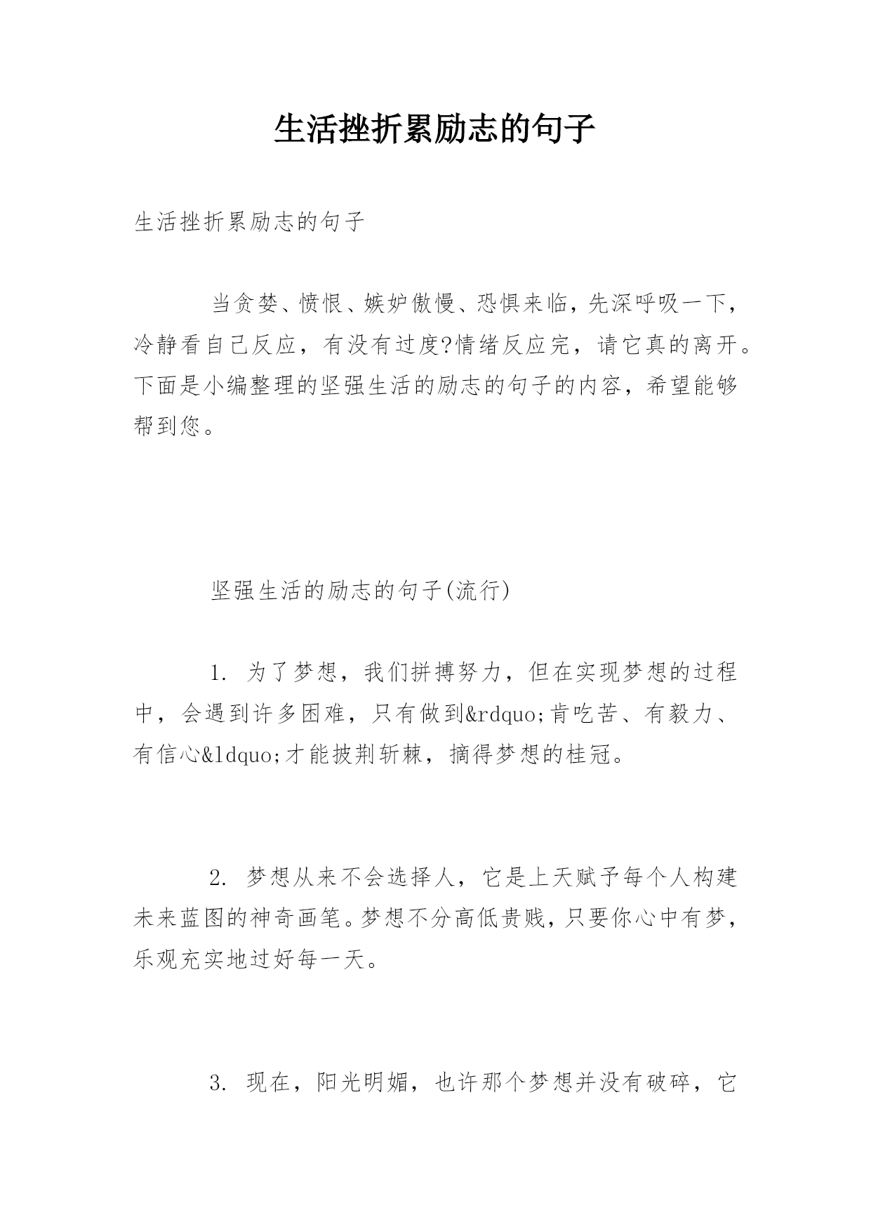 生活挫折累励志的句子生活挫折累励志的句子当贪婪、愤恨、嫉妒傲慢、恐惧来临,先深呼吸一下,冷静看自己反应,有没有过度?情绪反应完,请它真的离开。下面是小编整理的坚强生活的励志的句子的内容,希望能够帮到您。坚强生活的励志的句子(流行)1.为了梦想,我们拼搏努力,但在实现梦想的过程中,会遇到许多困难,只有做到”肯吃苦、有毅力、有信心“才能披荆斩棘,摘得梦想的桂冠。2.梦想从来不会选择人,它是上天赋予每个人构建未来蓝图的神奇画笔。梦想不分高低贵贱,只要你心中有梦,乐观充实地过好每一天。3.