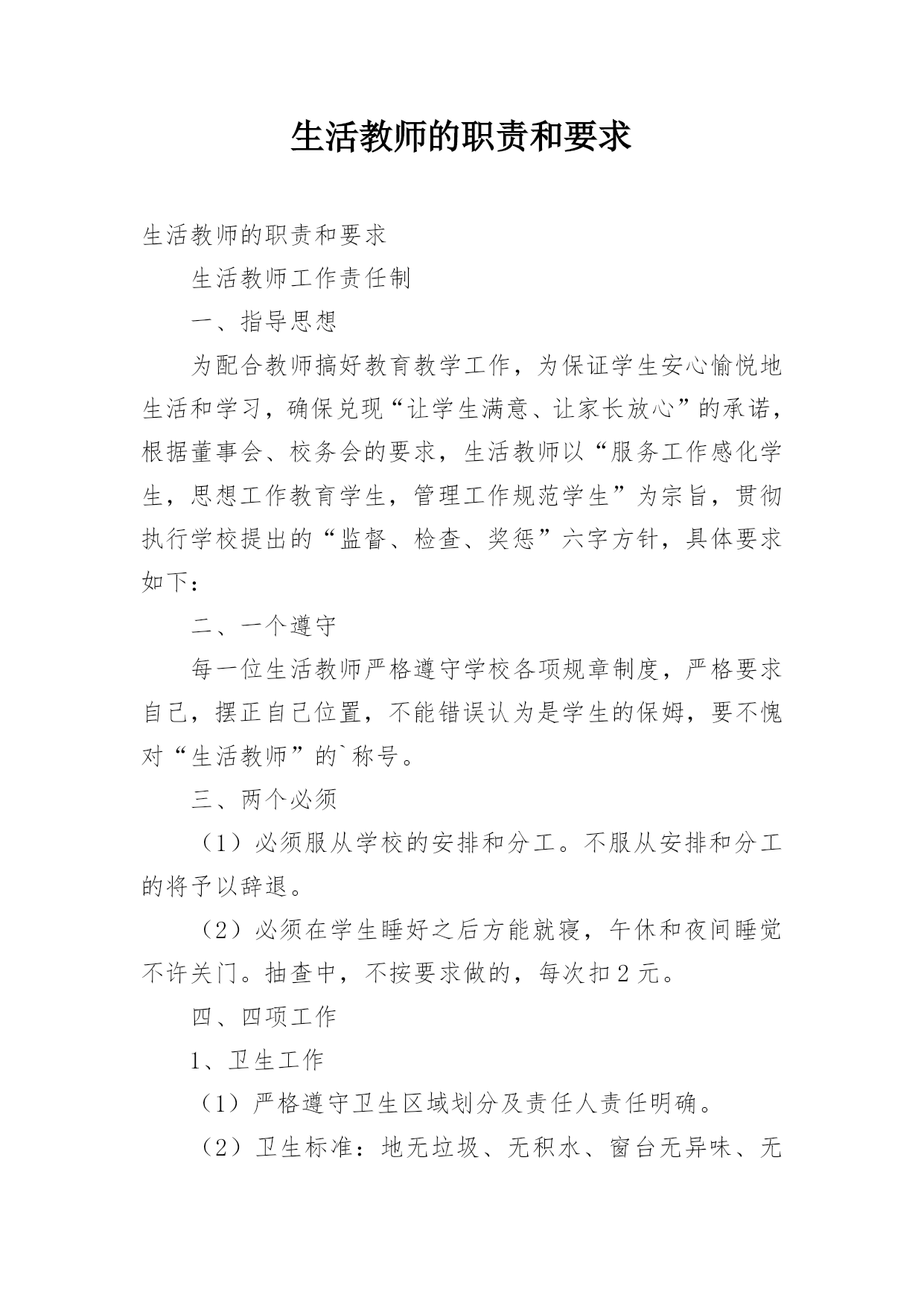 生活教师的职责和要求生活教师的职责和要求生活教师工作责任制一、指导思想为配合教师搞好教育教学工作,为保证学生安心愉悦地生活和学习,确保兑现“让学生满意、让家长放心”的承诺,根据董事会、校务会的要求,生活教师以“服务工作感化学生,思想工作教育学生,管理工作规范学生”为宗旨,贯彻执行学校提出的“监督、检查、奖惩”六字方针,具体要求如下:二、一个遵守每一位生活教师严格遵守学校各项规章制度,严格要求自己,摆正自己位置,不能错误认为是学生的保姆,要不愧对“生活教师”的`称号。三、两个必须(1)必须服从学校的安排和分
