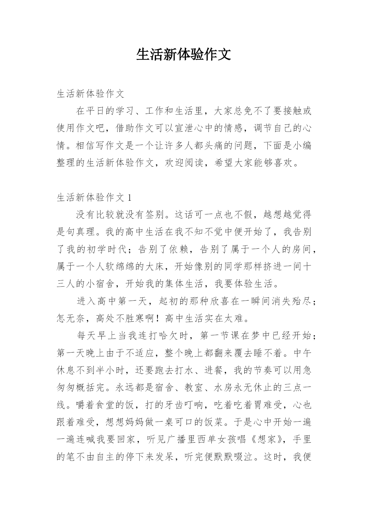生活新体验作文生活新体验作文在平日的学习、工作和生活里,大家总免不了要接触或使用作文吧,借助作文可以宣泄心中的情感,调节自己的心情。相信写作文是一个让许多人都头痛的问题,下面是小编整理的生活新体验作文,欢迎阅读,希望大家能够喜欢。生活新体验作文1没有比较就没有签别。这话可一点也不假,越想越觉得是句真理。我的高中生活在我不知不觉中便开始了,我告别了我的初学时代;告别了依赖,告别了属于一个人的房间,属于一个人软绵绵的大床,开始像别的同学那样挤进一间十三人的小宿舍,开始我的集体生活,我要体验生活。进入高中第一天