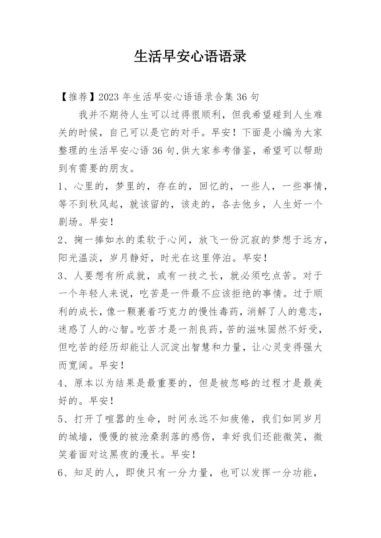 生活早安心语语录【推荐】2023年生活早安心语语录合集36句我并不期待人生可以过得很顺利,但我希望碰到人生难关的时候,自己可以是它的对手。早安!下面是小编为大家整理的生活早安心语36句,供大家参考借鉴,希望可以帮助到有需要的朋友。1、心里的,梦里的,存在的,回忆的,一些人,一些事情,等不到秋风起,就该留的,该走的,各去他乡,人生好一个剧场。早安!2、掬一捧如水的柔软于心间,放飞一份沉寂的梦想于远方,阳光温淡,岁月静好,时光在这里停泊。早安!3、人要想有所成就,或有一技之长,就必须吃点苦。对于一个年轻人来说