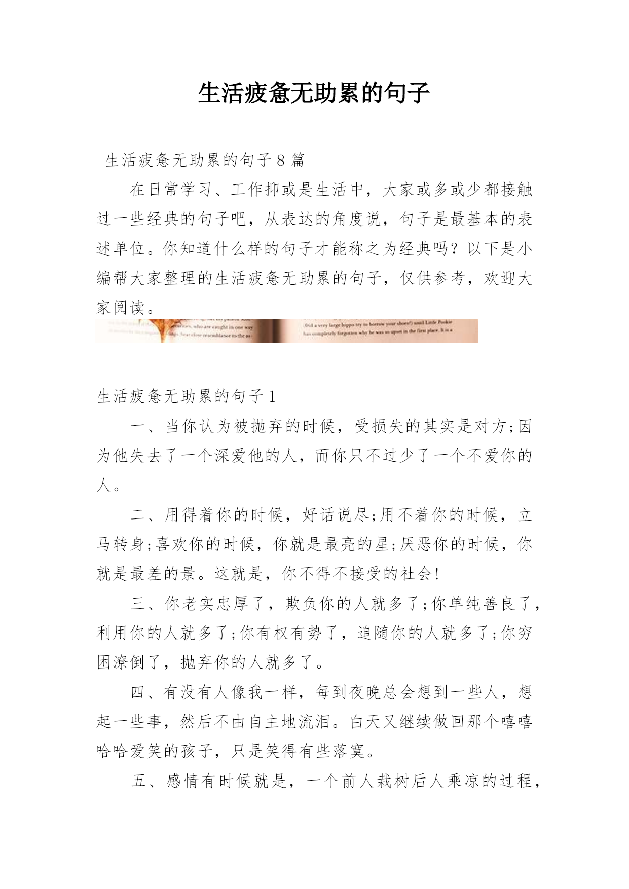 生活疲惫无助累的句子生活疲惫无助累的句子8篇在日常学习、工作抑或是生活中,大家或多或少都接触过一些经典的句子吧,从表达的角度说,句子是最基本的表述单位。你知道什么样的句子才能称之为经典吗?以下是小编帮大家整理的生活疲惫无助累的句子,仅供参考,欢迎大家阅读。生活疲惫无助累的句子1一、当你认为被抛弃的时候,受损失的其实是对方;因为他失去了一个深爱他的人,而你只不过少了一个不爱你的人。二、用得着你的时候,好话说尽;用不着你的时候,立马转身;喜欢你的时候,你就是最亮的星;厌恶你的时候,你就是最差的景。这就是,你不