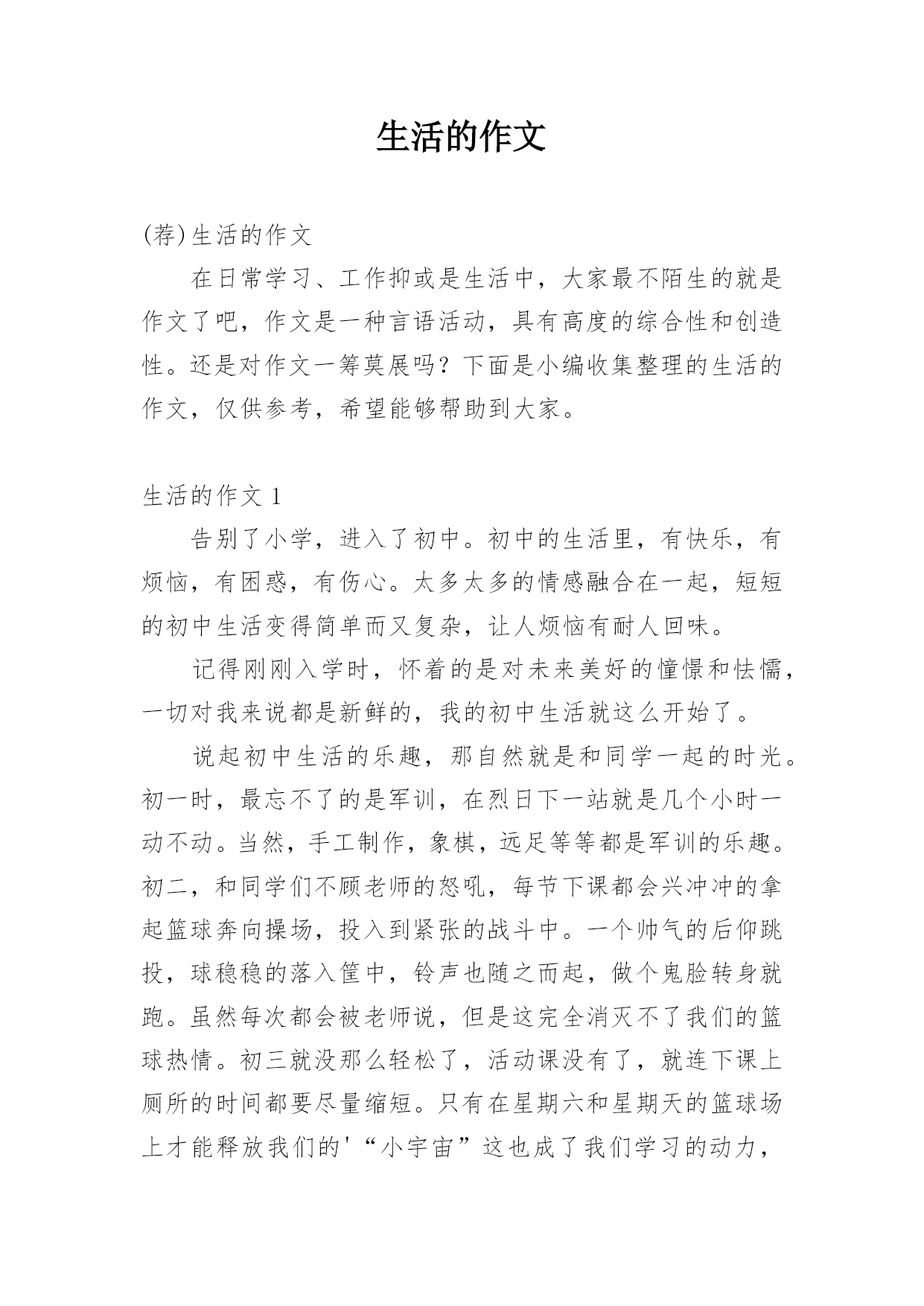生活的作文(荐)生活的作文在日常学习、工作抑或是生活中,大家最不陌生的就是作文了吧,作文是一种言语活动,具有高度的综合性和创造性。还是对作文一筹莫展吗?下面是小编收集整理的生活的作文,仅供参考,希望能够帮助到大家。生活的作文1告别了小学,进入了初中。初中的生活里,有快乐,有烦恼,有困惑,有伤心。太多太多的情感融合在一起,短短的初中生活变得简单而又复杂,让人烦恼有耐人回味。记得刚刚入学时,怀着的是对未来美好的憧憬和怯懦,一切对我来说都是新鲜的,我的初中生活就这么开始了。说起初中生活的乐趣,那自然就是和同学一