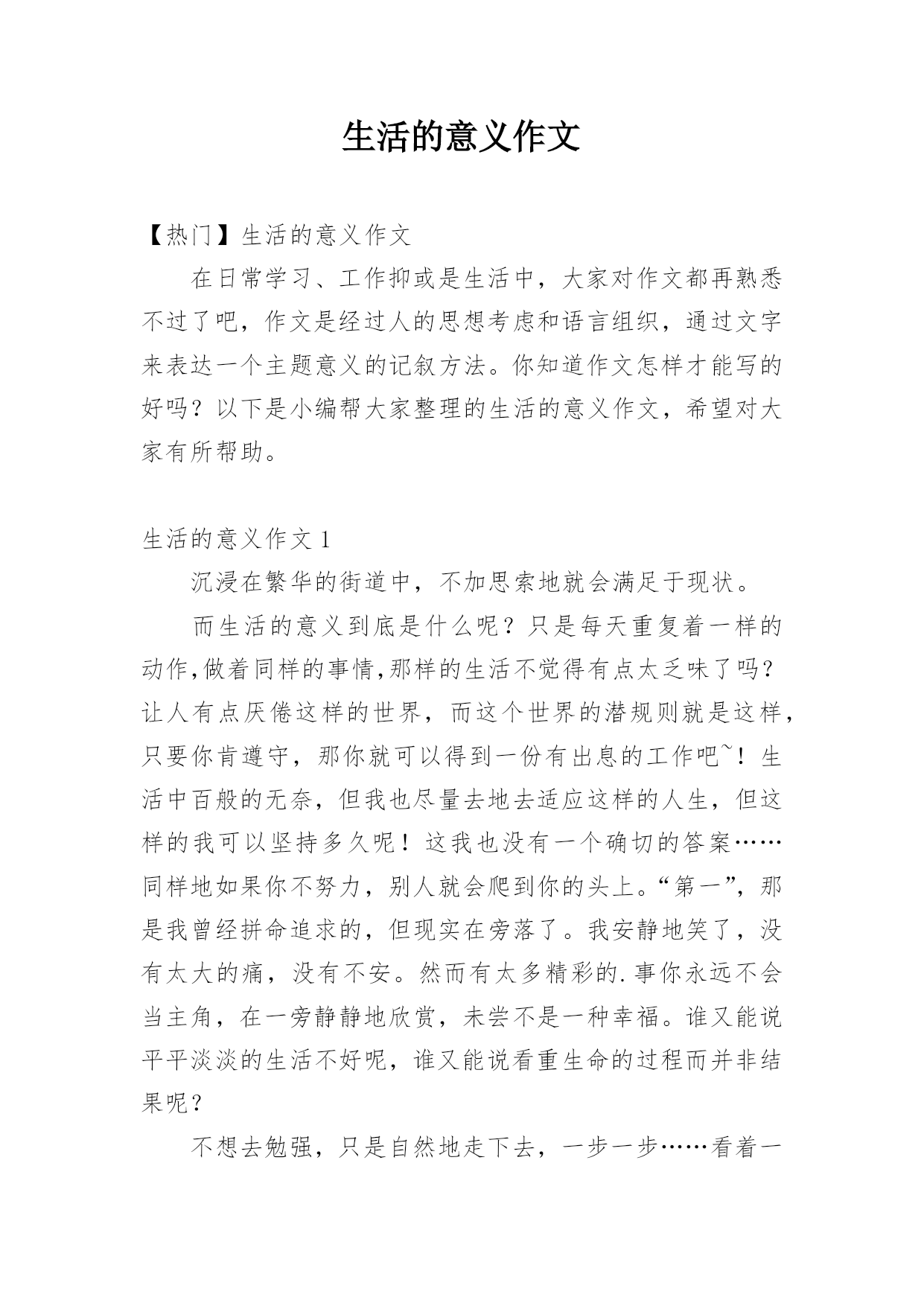 生活的意义作文【热门】生活的意义作文在日常学习、工作抑或是生活中,大家对作文都再熟悉不过了吧,作文是经过人的思想考虑和语言组织,通过文字来表达一个主题意义的记叙方法。你知道作文怎样才能写的好吗?以下是小编帮大家整理的生活的意义作文,希望对大家有所帮助。生活的意义作文1沉浸在繁华的街道中,不加思索地就会满足于现状。而生活的意义到底是什么呢?只是每天重复着一样的动作,做着同样的事情,那样的生活不觉得有点太乏味了吗?让人有点厌倦这样的世界,而这个世界的潜规则就是这样,只要你肯遵守,那你就可以得到一份有出息的工作