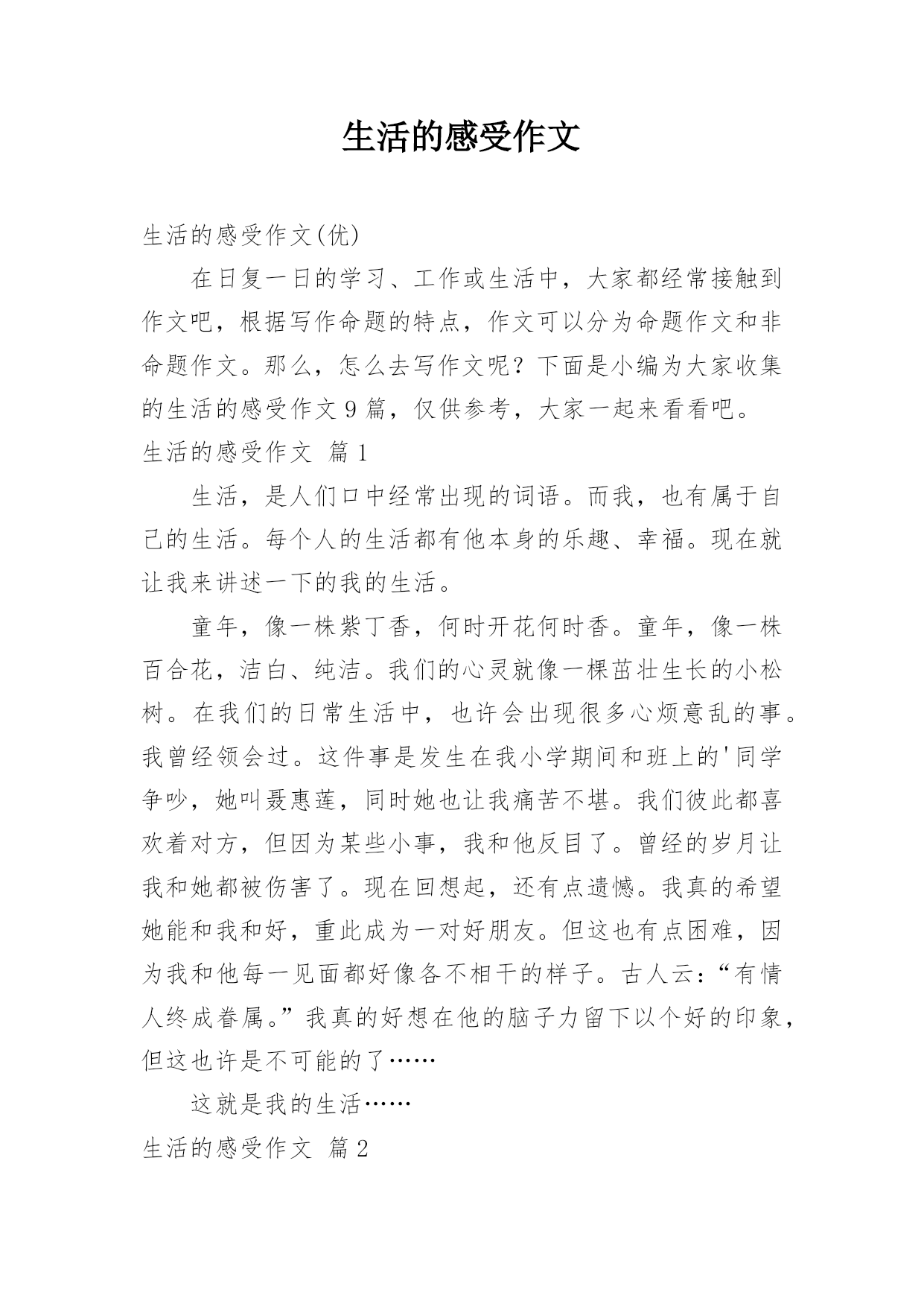 生活的感受作文生活的感受作文(优)在日复一日的学习、工作或生活中,大家都经常接触到作文吧,根据写作命题的特点,作文可以分为命题作文和非命题作文。那么,怎么去写作文呢?下面是小编为大家收集的生活的感受作文9篇,仅供参考,大家一起来看看吧。生活的感受作文篇1生活,是人们口中经常出现的词语。而我,也有属于自己的生活。每个人的生活都有他本身的乐趣、幸福。现在就让我来讲述一下的我的生活。童年,像一株紫丁香,何时开花何时香。童年,像一株百合花,洁白、纯洁。我们的心灵就像一棵茁壮生长的小松树。在我们的日常生活中,也许会