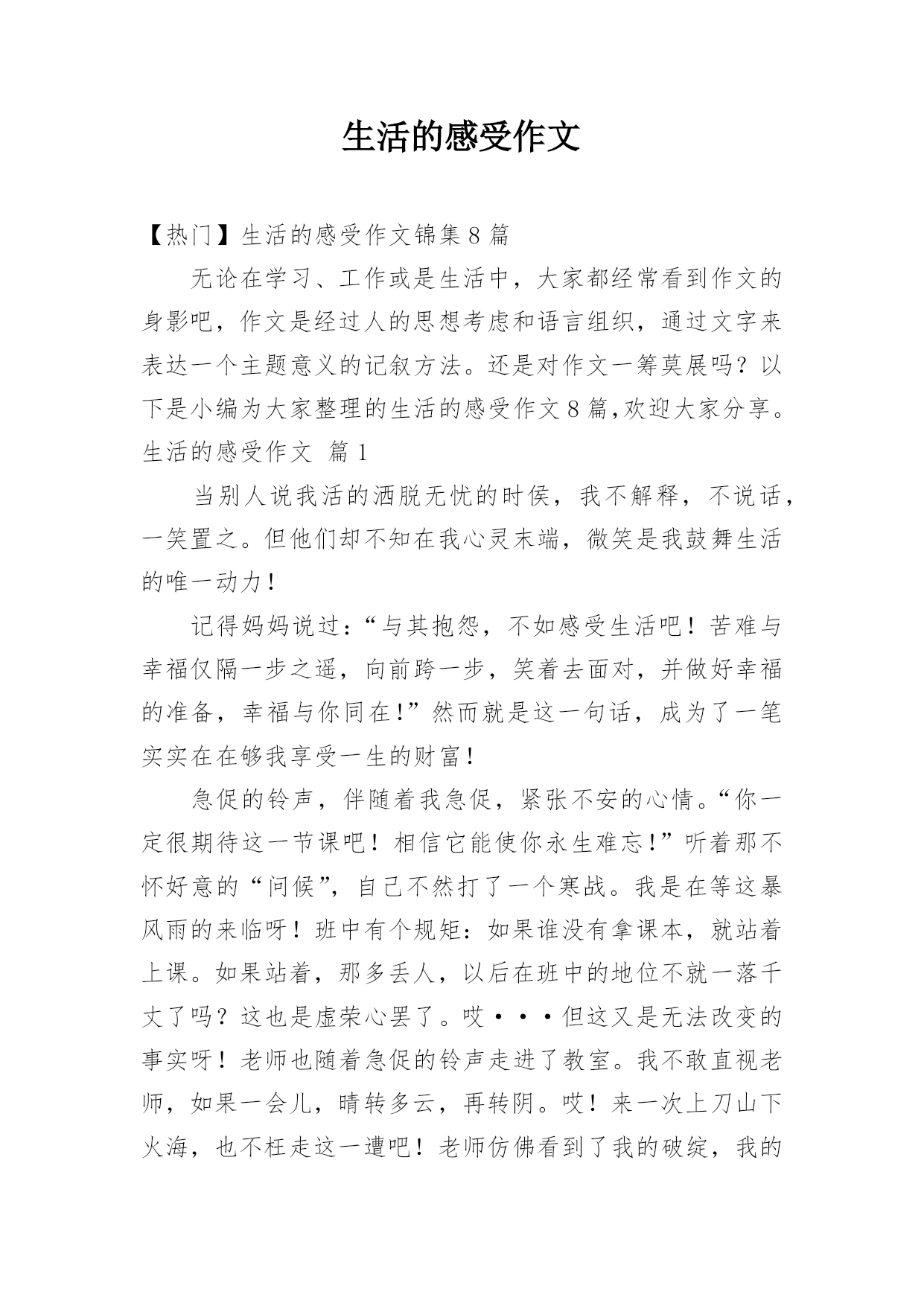 生活的感受作文【热门】生活的感受作文锦集8篇无论在学习、工作或是生活中,大家都经常看到作文的身影吧,作文是经过人的思想考虑和语言组织,通过文字来表达一个主题意义的记叙方法。还是对作文一筹莫展吗?以下是小编为大家整理的生活的感受作文8篇,欢迎大家分享。生活的感受作文篇1当别人说我活的洒脱无忧的时侯,我不解释,不说话,一笑置之。但他们却不知在我心灵末端,微笑是我鼓舞生活的唯一动力!记得妈妈说过:“与其抱怨,不如感受生活吧!苦难与幸福仅隔一步之遥,向前跨一步,笑着去面对,并做好幸福的准备,幸福与你同在!”然而就