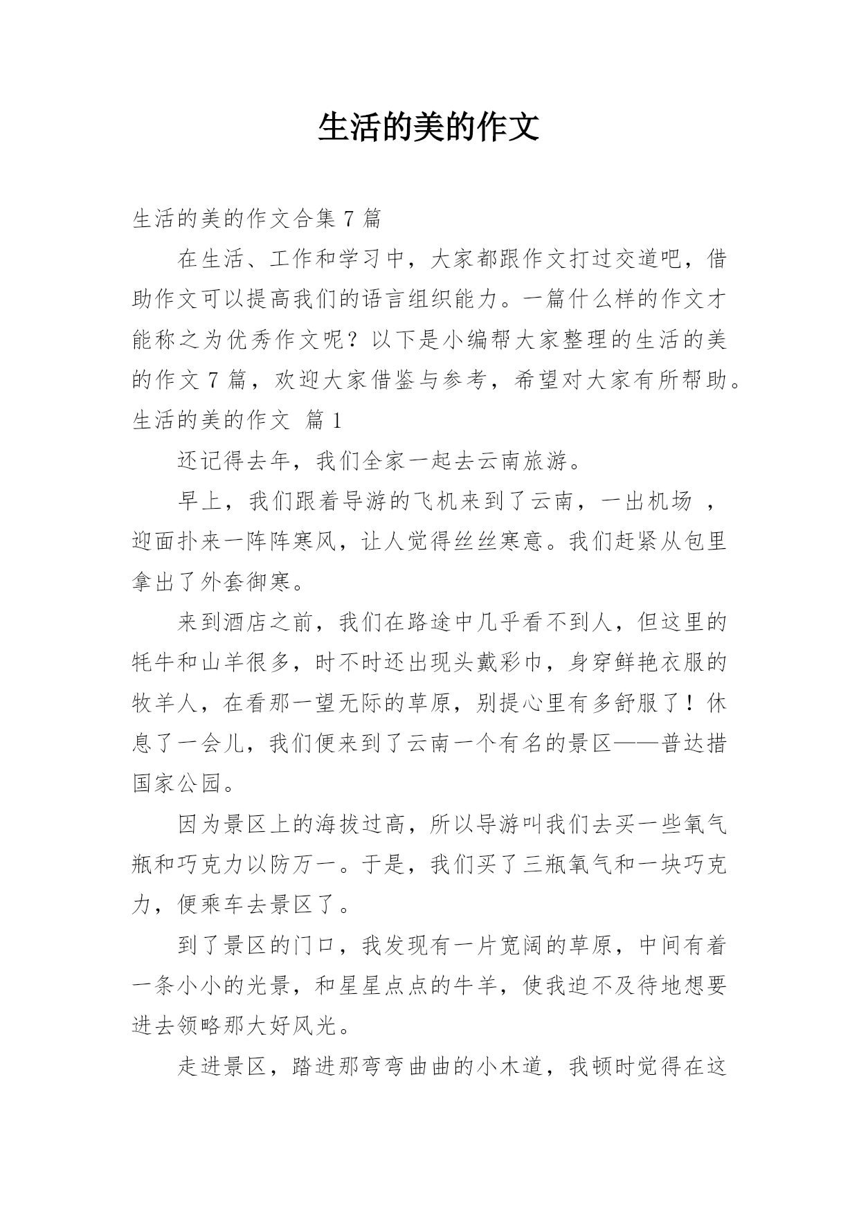 生活的美的作文生活的美的作文合集7篇在生活、工作和学习中,大家都跟作文打过交道吧,借助作文可以提高我们的语言组织能力。一篇什么样的作文才能称之为优秀作文呢?以下是小编帮大家整理的生活的美的作文7篇,欢迎大家借鉴与参考,希望对大家有所帮助。生活的美的作文篇1还记得去年,我们全家一起去云南旅游。早上,我们跟着导游的飞机来到了云南,一出机场,迎面扑来一阵阵寒风,让人觉得丝丝寒意。我们赶紧从包里拿出了外套御寒。来到酒店之前,我们在路途中几乎看不到人,但这里的牦牛和山羊很多,时不时还出现头戴彩巾,身穿鲜艳衣服的牧羊