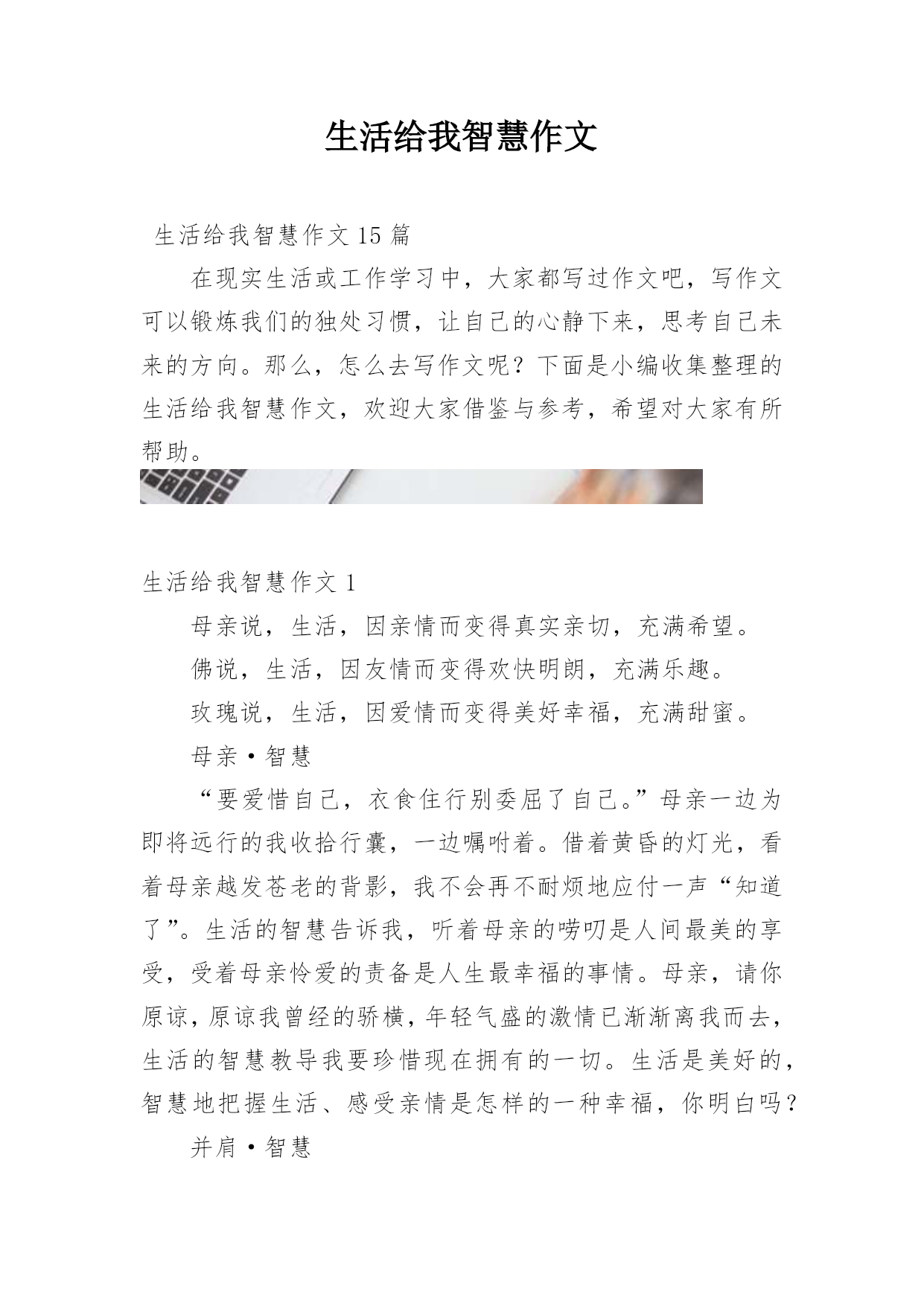 生活给我智慧作文生活给我智慧作文15篇在现实生活或工作学习中,大家都写过作文吧,写作文可以锻炼我们的独处习惯,让自己的心静下来,思考自己未来的方向。那么,怎么去写作文呢?下面是小编收集整理的生活给我智慧作文,欢迎大家借鉴与参考,希望对大家有所帮助。生活给我智慧作文1母亲说,生活,因亲情而变得真实亲切,充满希望。佛说,生活,因友情而变得欢快明朗,充满乐趣。玫瑰说,生活,因爱情而变得美好幸福,充满甜蜜。母亲·智慧“要爱惜自己,衣食住行别委屈了自己。”母亲一边为即将远行的我收拾行囊,一边嘱咐着。借着黄昏的灯光,