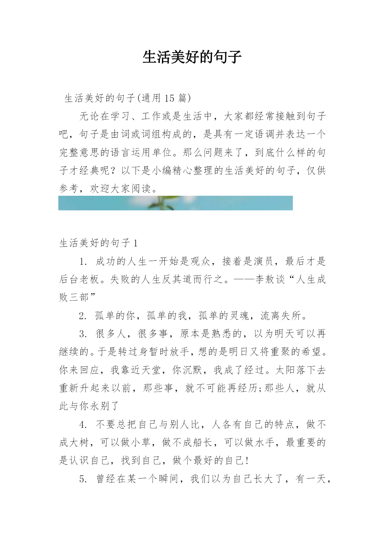 生活美好的句子生活美好的句子(通用15篇)无论在学习、工作或是生活中,大家都经常接触到句子吧,句子是由词或词组构成的,是具有一定语调并表达一个完整意思的语言运用单位。那么问题来了,到底什么样的句子才经典呢?以下是小编精心整理的生活美好的句子,仅供参考,欢迎大家阅读。生活美好的句子11.成功的人生一开始是观众,接着是演员,最后才是后台老板。失败的人生反其道而行之。——李敖谈“人生成败三部”2.孤单的你,孤单的我,孤单的灵魂,流离失所。3.很多人,很多事,原本是熟悉的,以为明天可以再继续的。于是转过身暂时放手