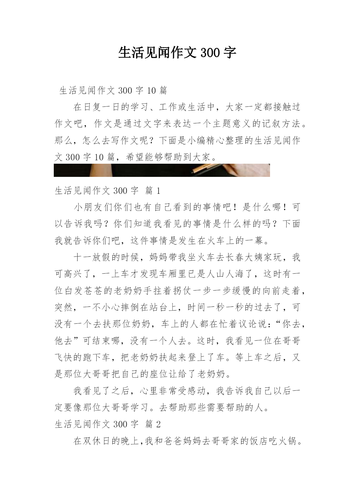 生活见闻作文300字生活见闻作文300字10篇在日复一日的学习、工作或生活中,大家一定都接触过作文吧,作文是通过文字来表达一个主题意义的记叙方法。那么,怎么去写作文呢?下面是小编精心整理的生活见闻作文300字10篇,希望能够帮助到大家。生活见闻作文300字篇1小朋友们你们也有自己看到的事情吧!是什么哪!可以告诉我吗?你们知道我看见的事情是什么样的吗?下面我就告诉你们吧,这件事情是发生在火车上的一幕。十一放假的时候,妈妈带我坐火车去长春大姨家玩,我可高兴了,一上车才发现车厢里已是人山人海了,这时有一位白发苍