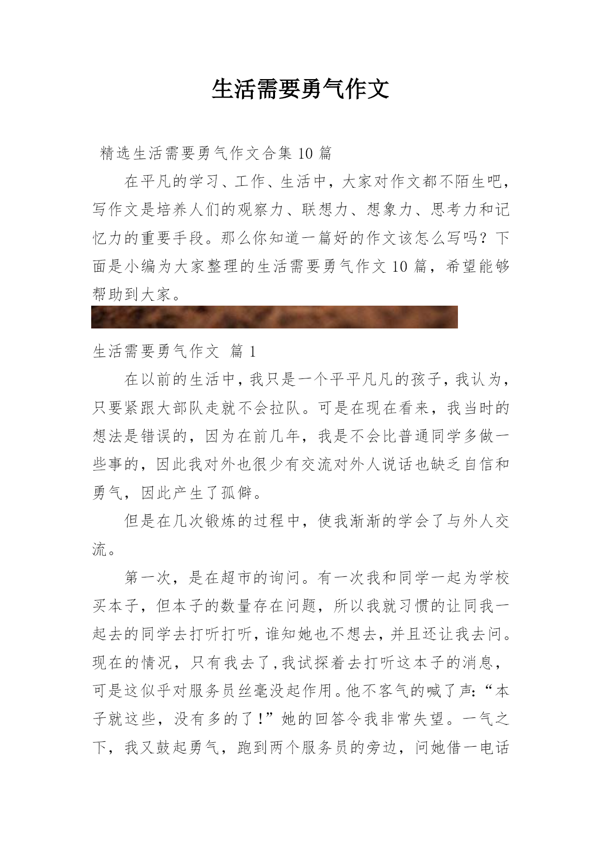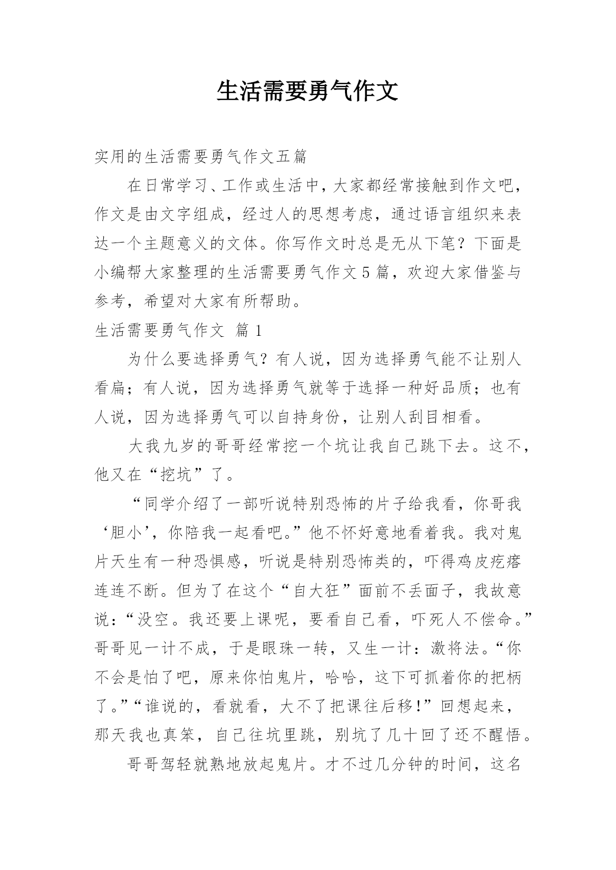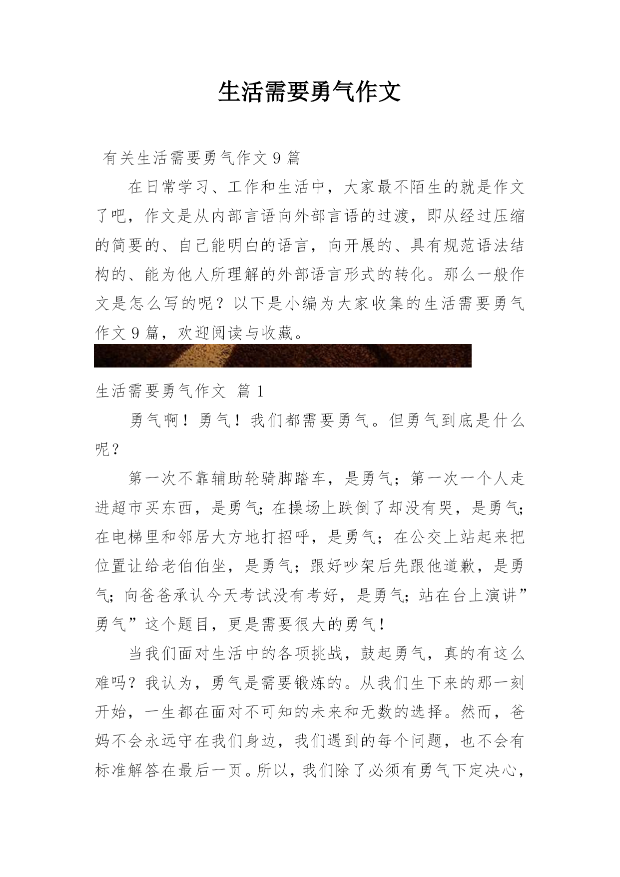生活需要勇气作文有关生活需要勇气作文9篇在日常学习、工作和生活中,大家最不陌生的就是作文了吧,作文是从内部言语向外部言语的过渡,即从经过压缩的简要的、自己能明白的语言,向开展的、具有规范语法结构的、能为他人所理解的外部语言形式的转化。那么一般作文是怎么写的呢?以下是小编为大家收集的生活需要勇气作文9篇,欢迎阅读与收藏。生活需要勇气作文篇1勇气啊!勇气!我们都需要勇气。但勇气到底是什么呢?第一次不靠辅助轮骑脚踏车,是勇气;第一次一个人走进超市买东西,是勇气;在操场上跌倒了却没有哭,是勇气;在电梯里和邻居大方