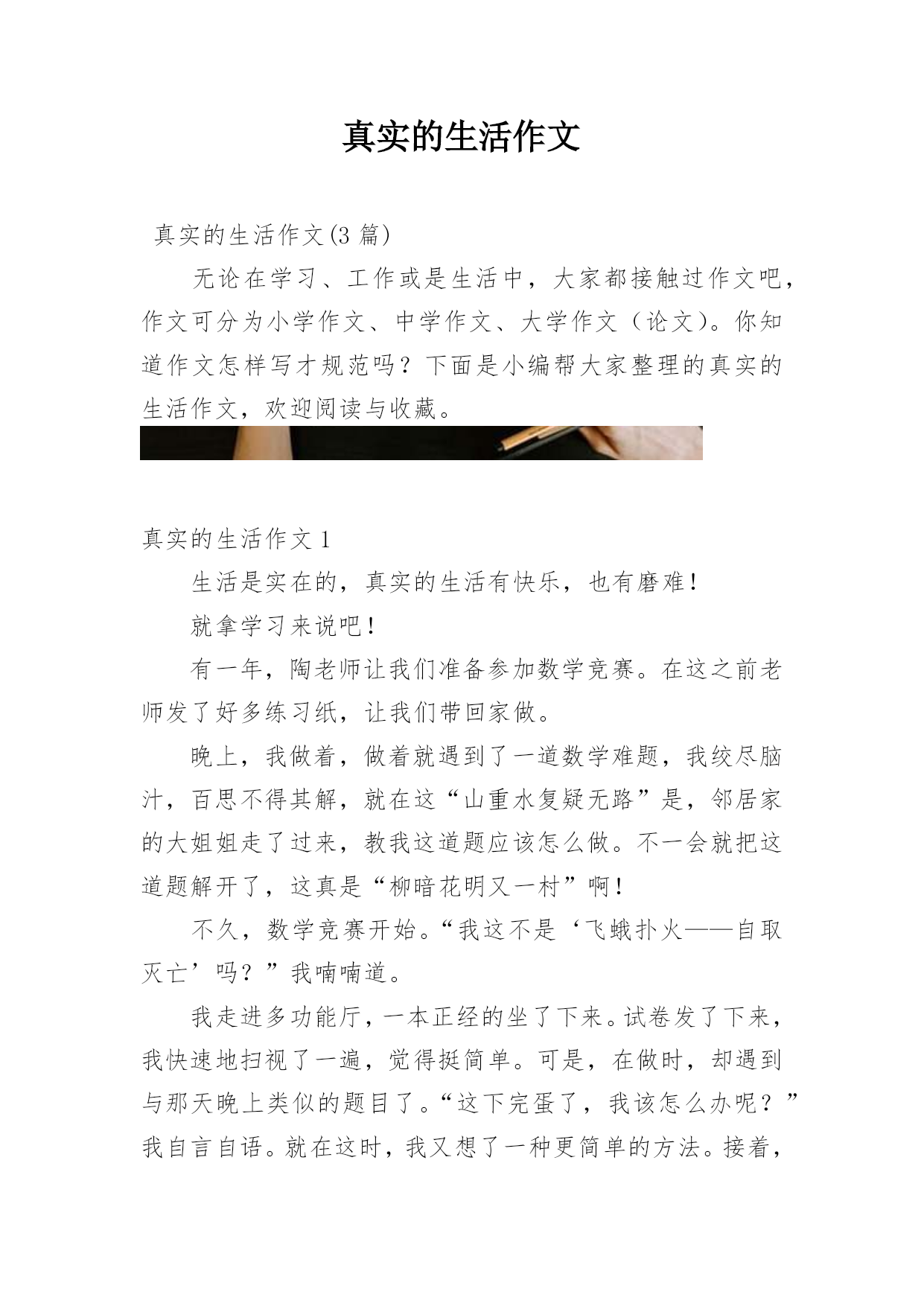 真实的生活作文真实的生活作文(3篇)无论在学习、工作或是生活中,大家都接触过作文吧,作文可分为小学作文、中学作文、大学作文(论文)。你知道作文怎样写才规范吗?下面是小编帮大家整理的真实的生活作文,欢迎阅读与收藏。真实的生活作文1生活是实在的,真实的生活有快乐,也有磨难!就拿学习来说吧!有一年,陶老师让我们准备参加数学竞赛。在这之前老师发了好多练习纸,让我们带回家做。晚上,我做着,做着就遇到了一道数学难题,我绞尽脑汁,百思不得其解,就在这“山重水复疑无路”是,邻居家的大姐姐走了过来,教我这道题应该怎么做。不