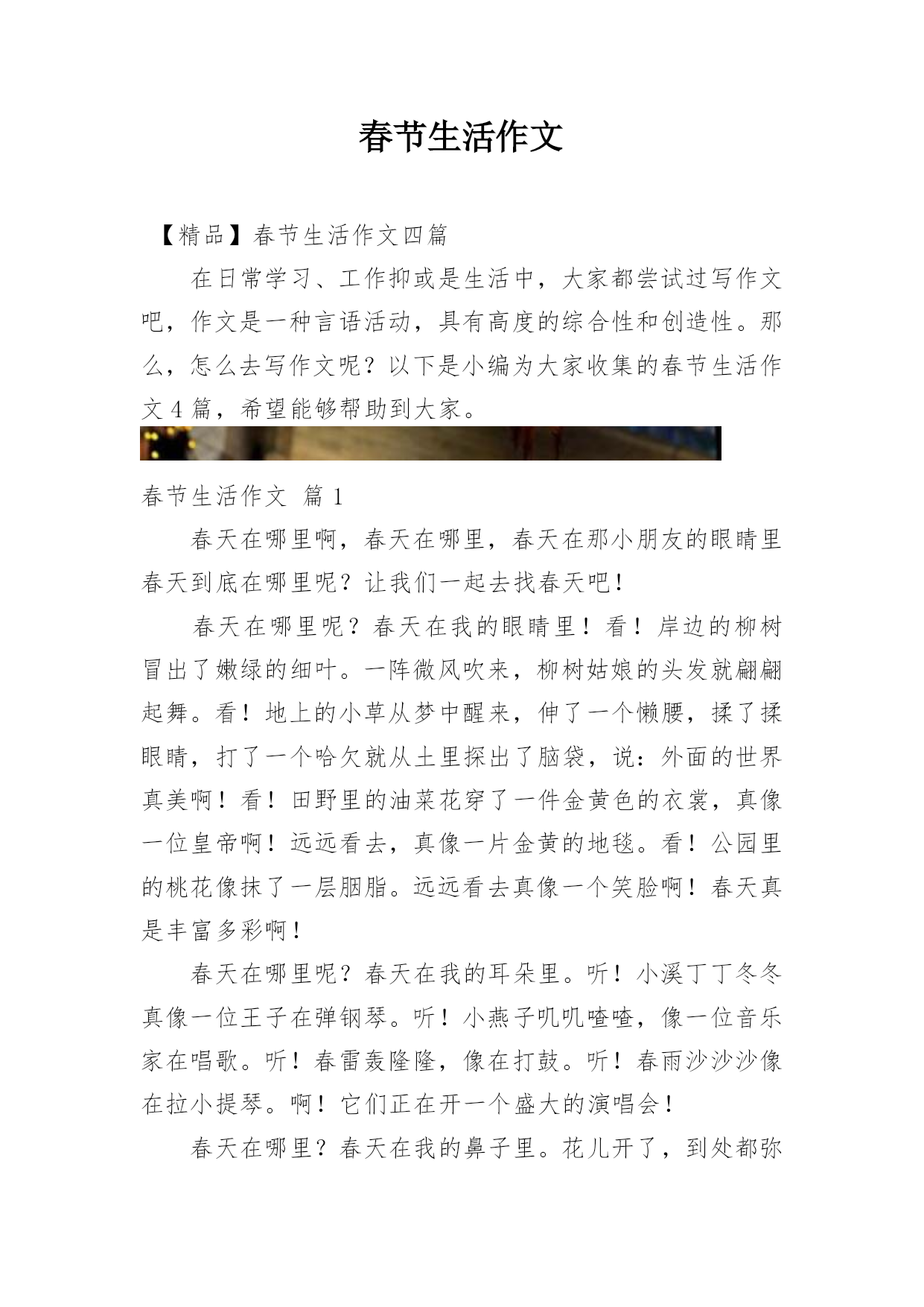 春节生活作文【精品】春节生活作文四篇在日常学习、工作抑或是生活中,大家都尝试过写作文吧,作文是一种言语活动,具有高度的综合性和创造性。那么,怎么去写作文呢?以下是小编为大家收集的春节生活作文4篇,希望能够帮助到大家。春节生活作文篇1春天在哪里啊,春天在哪里,春天在那小朋友的眼睛里春天到底在哪里呢?让我们一起去找春天吧!春天在哪里呢?春天在我的眼睛里!看!岸边的柳树冒出了嫩绿的细叶。一阵微风吹来,柳树姑娘的头发就翩翩起舞。看!地上的小草从梦中醒来,伸了一个懒腰,揉了揉眼睛,打了一个哈欠就从土里探出了脑袋,说