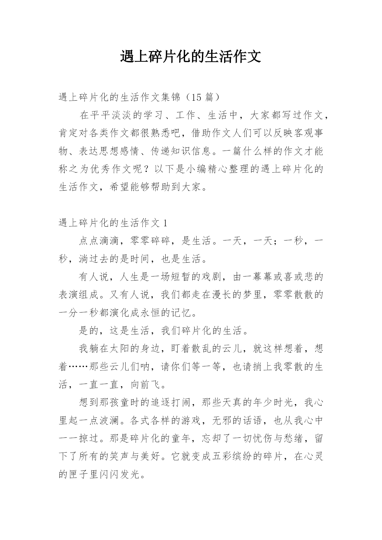 遇上碎片化的生活作文遇上碎片化的生活作文集锦(15篇)在平平淡淡的学习、工作、生活中,大家都写过作文,肯定对各类作文都很熟悉吧,借助作文人们可以反映客观事物、表达思想感情、传递知识信息。一篇什么样的作文才能称之为优秀作文呢?以下是小编精心整理的遇上碎片化的生活作文,希望能够帮助到大家。遇上碎片化的生活作文1点点滴滴,零零碎碎,是生活。一天,一天;一秒,一秒,淌过去的是时间,也是生活。有人说,人生是一场短暂的戏剧,由一幕幕或喜或悲的表演组成。又有人说,我们都走在漫长的梦里,零零散散的一分一秒都演化成永恒的记