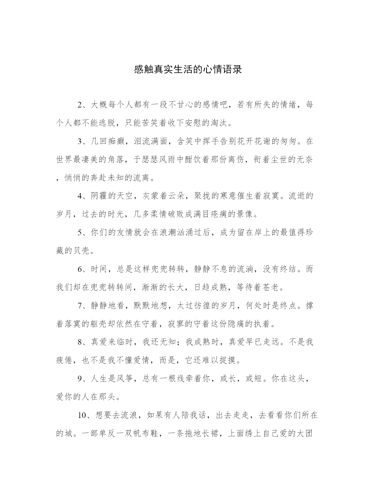 感触真实生活的心情语录2、大概每个人都有一段不甘心的感情吧,若有所失的情绪,每个人都不能逃脱,只能苦笑着收下安慰的淘汰。3、几回痴癫,泪流满面,含笑中挥手告别花开花谢的匆匆。在世界最凄美的角落,于瑟瑟风雨中酣饮着那份离伤,衔着尘世的无奈,悄悄的奔赴未知的流离。4、阴霾的天空,灰蒙着云朵,聚拢的寒意催生着寂寞。流逝的岁月,过去的时光,几多柔情破败成满目疮痍的景像。5、你们的友情就会在浪潮汹涌过后,成为留在岸上的最值得珍藏的贝壳。6、时间,总是这样兜兜转转,静静不息的流淌,没有终结。而我们却在兜兜转转间,渐渐