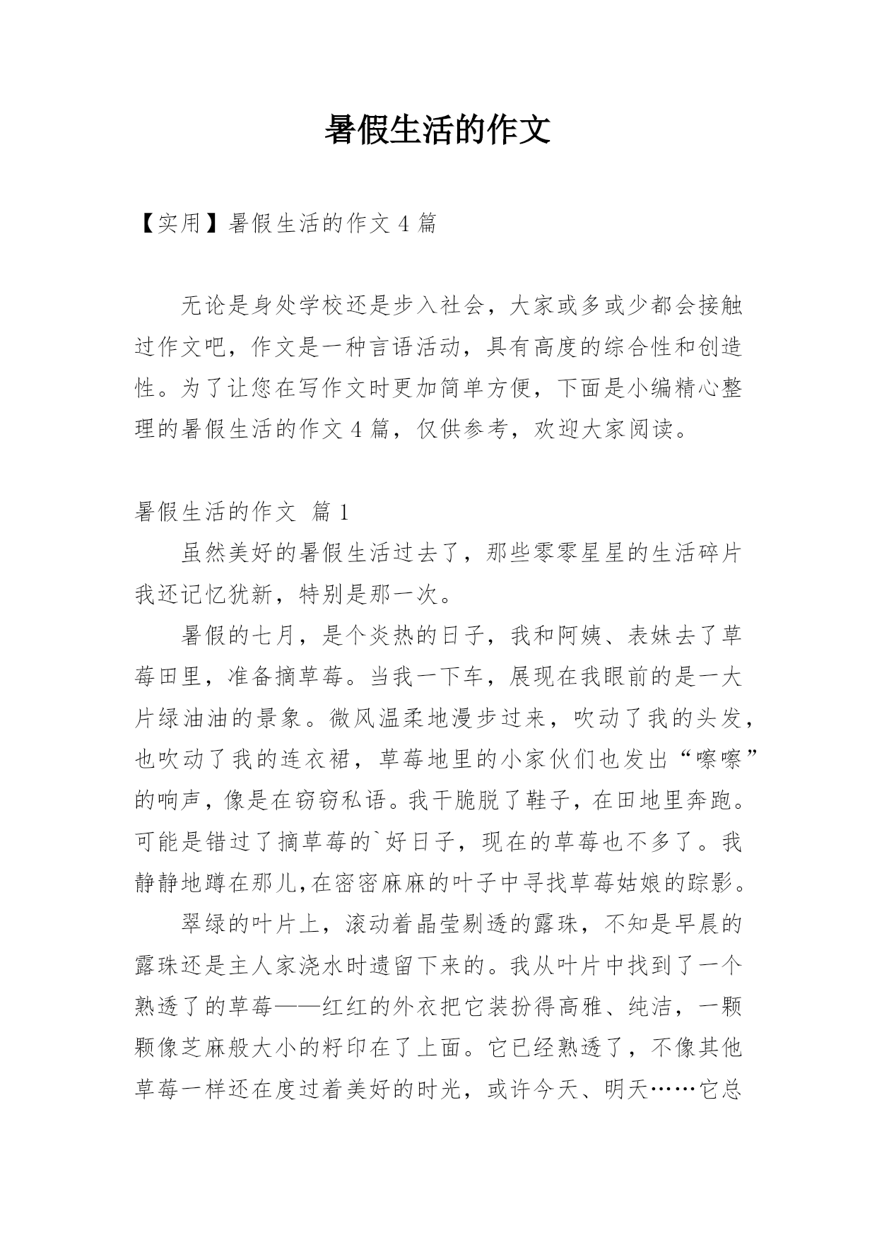 暑假生活的作文【实用】暑假生活的作文4篇无论是身处学校还是步入社会,大家或多或少都会接触过作文吧,作文是一种言语活动,具有高度的综合性和创造性。为了让您在写作文时更加简单方便,下面是小编精心整理的暑假生活的作文4篇,仅供参考,欢迎大家阅读。暑假生活的作文篇1虽然美好的暑假生活过去了,那些零零星星的生活碎片我还记忆犹新,特别是那一次。暑假的七月,是个炎热的日子,我和阿姨、表妹去了草莓田里,准备摘草莓。当我一下车,展现在我眼前的是一大片绿油油的景象。微风温柔地漫步过来,吹动了我的头发,也吹动了我的连衣裙,草莓