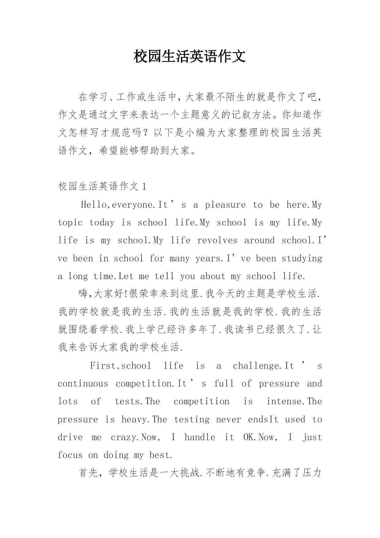 校园生活英语作文在学习、工作或生活中,大家最不陌生的就是作文了吧,作文是通过文字来表达一个主题意义的记叙方法。你知道作文怎样写才规范吗?以下是小编为大家整理的校园生活英语作文,希望能够帮助到大家。校园生活英语作文1Hello,everyone.It’sapleasuretobehere.Mytopictodayisschoollife.Myschoolismylife.Mylifeismyschool.Myliferevolvesaroundschool.I’vebeeninschoolformanyye