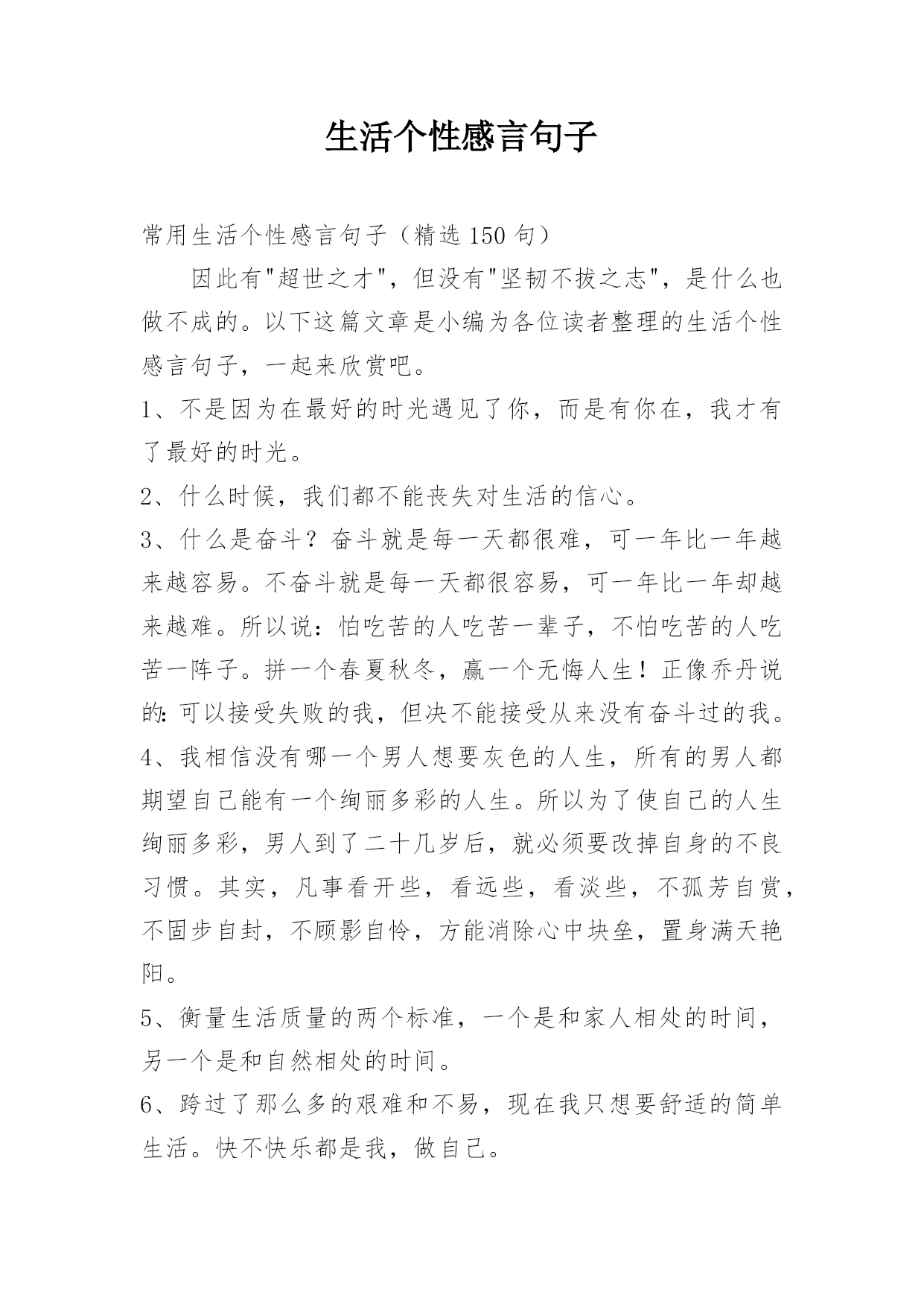 生活个性感言句子常用生活个性感言句子(精选150句)因此有"超世之才",但没有"坚韧不拔之志",是什么也做不成的。以下这篇文章是小编为各位读者整理的生活个性感言句子,一起来欣赏吧。1、不是因为在最好的时光遇见了你,而是有你在,我才有了最好的时光。2、什么时候,我们都不能丧失对生活的信心。3、什么是奋斗?奋斗就是每一天都很难,可一年比一年越来越容易。不奋斗就是每一天都很容易,可一年比一年却越来越难。所以说:怕吃苦的人吃苦一辈子,不怕吃苦的人吃苦一阵子。拼一个春夏秋冬,赢一个无悔人生!正像乔丹说的:可以接受失