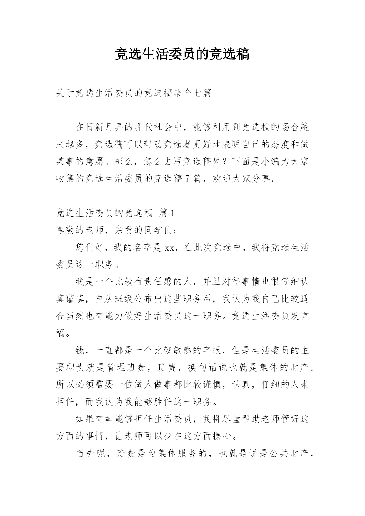 竞选生活委员的竞选稿关于竞选生活委员的竞选稿集合七篇在日新月异的现代社会中,能够利用到竞选稿的场合越来越多,竞选稿可以帮助竞选者更好地表明自己的态度和做某事的意愿。那么,怎么去写竞选稿呢?下面是小编为大家收集的竞选生活委员的竞选稿7篇,欢迎大家分享。竞选生活委员的竞选稿篇1尊敬的老师,亲爱的同学们:您们好,我的名字是xx,在此次竞选中,我将竞选生活委员这一职务。我是一个比较有责任感的人,并且对待事情也很仔细认真谨慎,自从班级公布出这些职务后,我认为我自己比较适合当然也有能力做好生活委员这一职务。竞选生活委