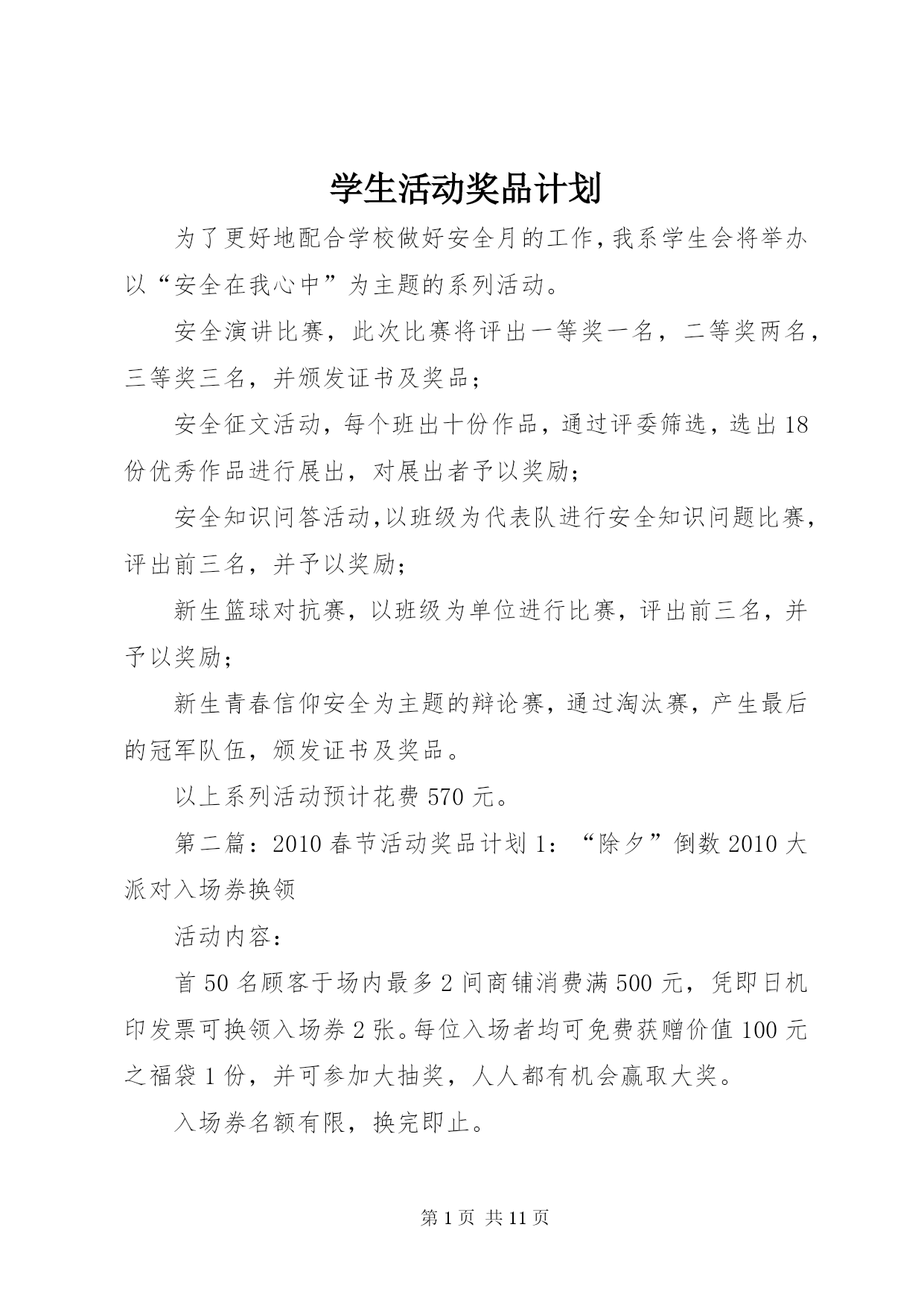第PAGE\*Arabic\*MERGEFORMAT11页共NUMPAGES\*MERGEFORMAT11页学生活动奖品计划为了更好地配合学校做好安全月的工作,我系学生会将举办以“安全在我心中”为主题的系列活动。安全演讲比赛,此次比赛将评出一等奖一名,二等奖两名,三等奖三名,并颁发证书及奖品;安全征文活动,每个班出十份作品,通过评委筛选,选出18份优秀作品进行展出,对展出者予以奖励;安全知识问答活动,以班级为代表队进行安全知识问题比赛,评出前三名,并予以奖励;新生篮球对抗赛,以班级为单位进行比