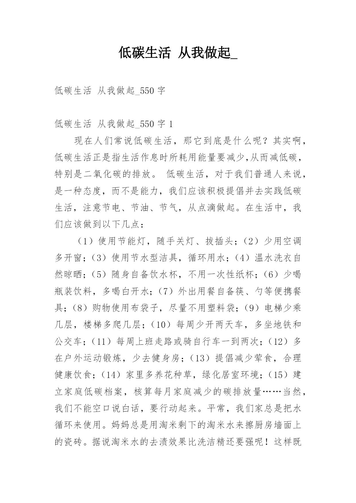 低碳生活从我做起_低碳生活从我做起_550字低碳生活从我做起_550字1现在人们常说低碳生活,那它到底是什么呢?其实啊,低碳生活正是指生活作息时所耗用能量要减少,从而减低碳,特别是二氧化碳的排放。低碳生活,对于我们普通人来说,是一种态度,而不是能力,我们应该积极提倡并去实践低碳生活,注意节电、节油、节气,从点滴做起。在生活中,我们应该做到以下几点:(1)使用节能灯,随手关灯、拔插头;(2)少用空调多开窗;(3)使用节水型洁具,循环用水;(4)温水洗衣自然晾晒;(5)随身自备饮水杯,不用一次性纸杯;(6)少