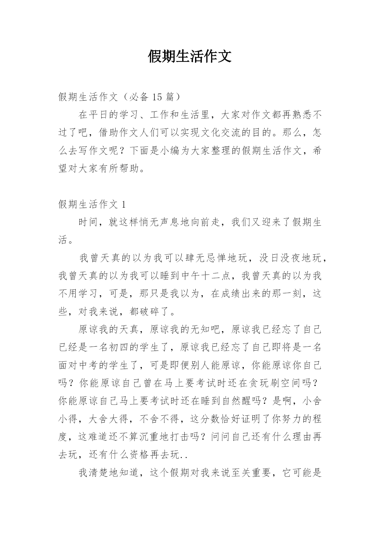 假期生活作文假期生活作文(必备15篇)在平日的学习、工作和生活里,大家对作文都再熟悉不过了吧,借助作文人们可以实现文化交流的目的。那么,怎么去写作文呢?下面是小编为大家整理的假期生活作文,希望对大家有所帮助。假期生活作文1时间,就这样悄无声息地向前走,我们又迎来了假期生活。我曾天真的以为我可以肆无忌惮地玩,没日没夜地玩,我曾天真的以为我可以睡到中午十二点,我曾天真的以为我不用学习,可是,那只是我以为,在成绩出来的那一刻,这些,对我来说,都破碎了。原谅我的天真,原谅我的无知吧,原谅我已经忘了自己已经是一名初