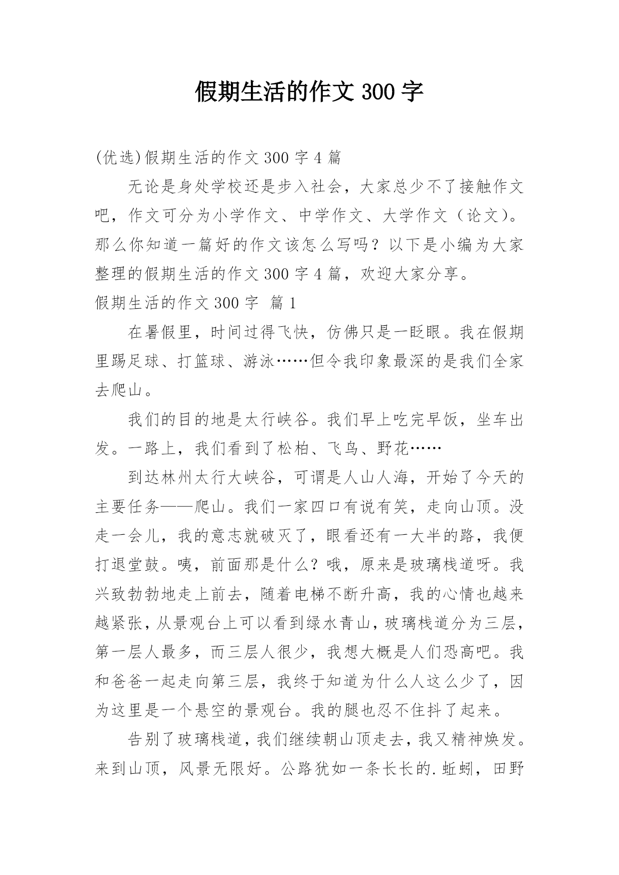 假期生活的作文300字(优选)假期生活的作文300字4篇无论是身处学校还是步入社会,大家总少不了接触作文吧,作文可分为小学作文、中学作文、大学作文(论文)。那么你知道一篇好的作文该怎么写吗?以下是小编为大家整理的假期生活的作文300字4篇,欢迎大家分享。假期生活的作文300字篇1在暑假里,时间过得飞快,仿佛只是一眨眼。我在假期里踢足球、打篮球、游泳……但令我印象最深的是我们全家去爬山。我们的目的地是太行峡谷。我们早上吃完早饭,坐车出发。一路上,我们看到了松柏、飞鸟、野花……到达林州太行大峡谷,可谓是人山人