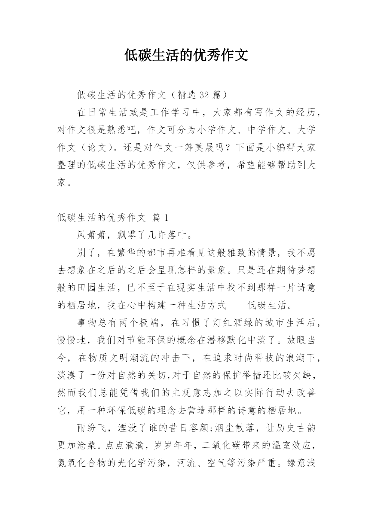 低碳生活的优秀作文低碳生活的优秀作文(精选32篇)在日常生活或是工作学习中,大家都有写作文的经历,对作文很是熟悉吧,作文可分为小学作文、中学作文、大学作文(论文)。还是对作文一筹莫展吗?下面是小编帮大家整理的低碳生活的优秀作文,仅供参考,希望能够帮助到大家。低碳生活的优秀作文篇1风萧萧,飘零了几许落叶。别了,在繁华的都市再难看见这般雅致的情景,我不愿去想象在之后的之后会呈现怎样的景象。只是还在期待梦想般的田园生活,已不至于在现实生活中找不到那样一片诗意的栖居地,我在心中构建一种生活方式——低碳生活。事物总