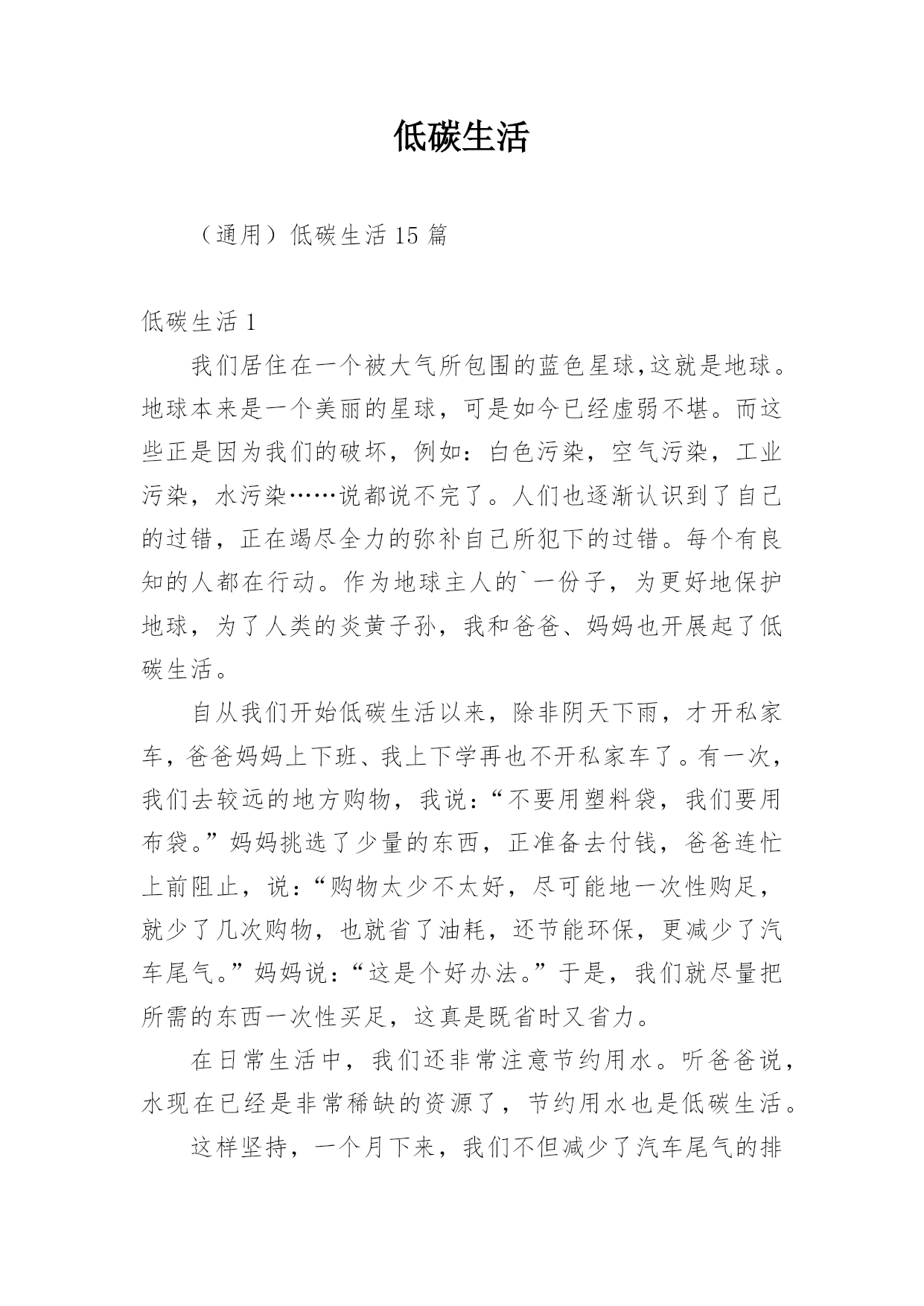 低碳生活(通用)低碳生活15篇低碳生活1我们居住在一个被大气所包围的蓝色星球,这就是地球。地球本来是一个美丽的星球,可是如今已经虚弱不堪。而这些正是因为我们的破坏,例如:白色污染,空气污染,工业污染,水污染……说都说不完了。人们也逐渐认识到了自己的过错,正在竭尽全力的弥补自己所犯下的过错。每个有良知的人都在行动。作为地球主人的`一份子,为更好地保护地球,为了人类的炎黄子孙,我和爸爸、妈妈也开展起了低碳生活。自从我们开始低碳生活以来,除非阴天下雨,才开私家车,爸爸妈妈上下班、我上下学再也不开私家车了。有一次
