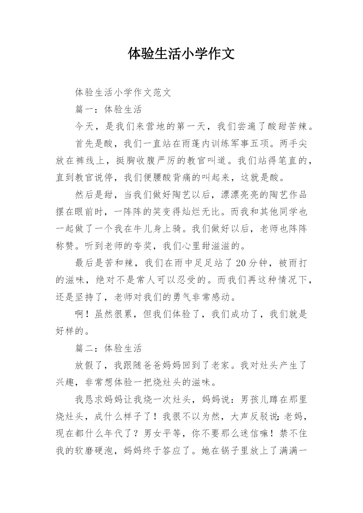 体验生活小学作文体验生活小学作文范文篇一:体验生活今天,是我们来营地的第一天,我们尝遍了酸甜苦辣。首先是酸,我们一直站在雨蓬内训练军事五项。两手尖放在裤线上,挺胸收腹严厉的教官叫道。我们站得笔直的,直到教官说停,我们便腰酸背痛的叫起来,这就是酸。然后是甜,当我们做好陶艺以后,漂漂亮亮的陶艺作品摆在眼前时,一阵阵的笑变得灿烂无比。而我和其他同学也一起做了一个我在牛儿身上骑。我们做好以后,老师也阵阵称赞。听到老师的夸奖,我们心里甜滋滋的。最后是苦和辣,我们在雨中足足站了20分钟,被雨打的滋味,绝对不是常人可以