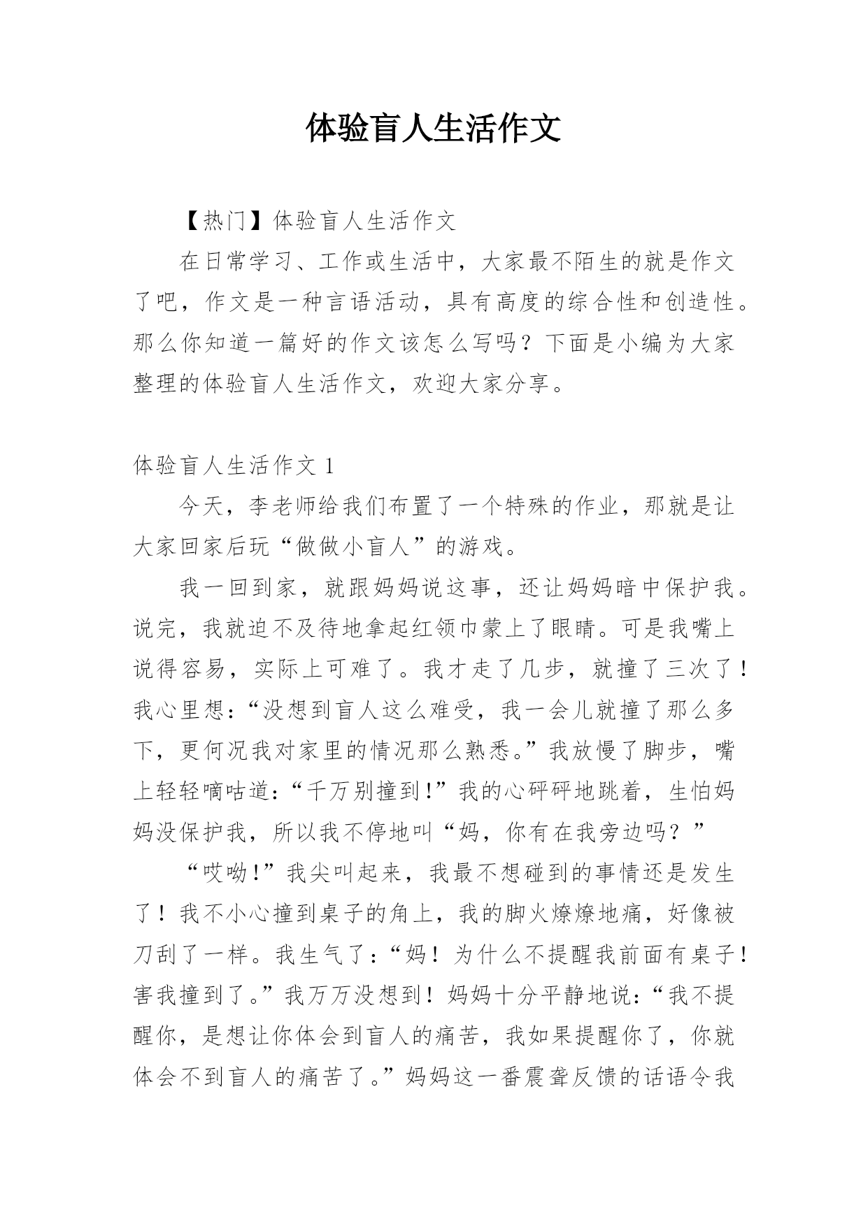 体验盲人生活作文【热门】体验盲人生活作文在日常学习、工作或生活中,大家最不陌生的就是作文了吧,作文是一种言语活动,具有高度的综合性和创造性。那么你知道一篇好的作文该怎么写吗?下面是小编为大家整理的体验盲人生活作文,欢迎大家分享。体验盲人生活作文1今天,李老师给我们布置了一个特殊的作业,那就是让大家回家后玩“做做小盲人”的游戏。我一回到家,就跟妈妈说这事,还让妈妈暗中保护我。说完,我就迫不及待地拿起红领巾蒙上了眼睛。可是我嘴上说得容易,实际上可难了。我才走了几步,就撞了三次了!我心里想:“没想到盲人这么难受