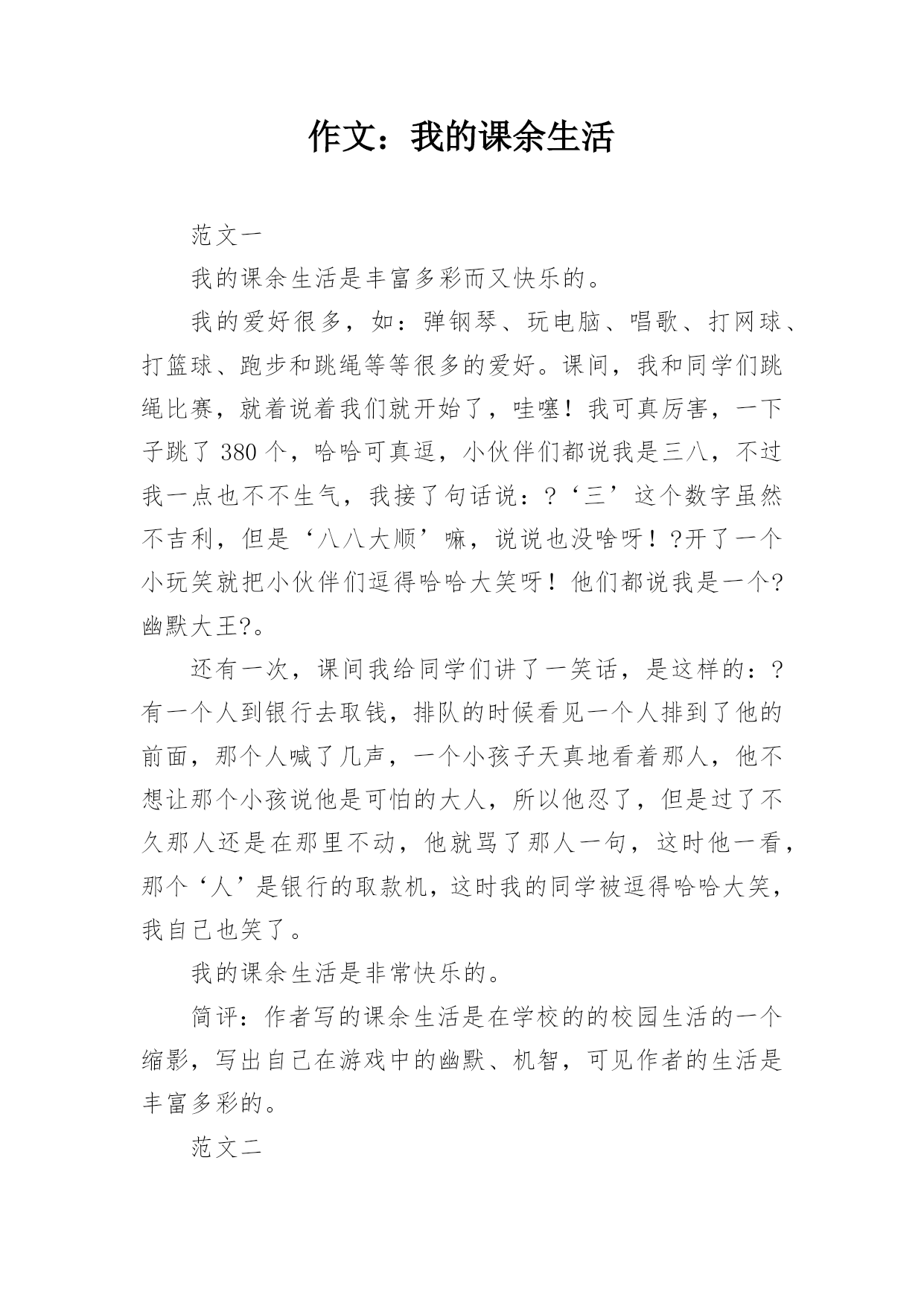 作文:我的课余生活范文一我的课余生活是丰富多彩而又快乐的。我的爱好很多,如:弹钢琴、玩电脑、唱歌、打网球、打篮球、跑步和跳绳等等很多的爱好。课间,我和同学们跳绳比赛,就着说着我们就开始了,哇噻!我可真厉害,一下子跳了380个,哈哈可真逗,小伙伴们都说我是三八,不过我一点也不不生气,我接了句话说:?‘三’这个数字虽然不吉利,但是‘八八大顺’嘛,说说也没啥呀!?开了一个小玩笑就把小伙伴们逗得哈哈大笑呀!他们都说我是一个?幽默大王?。还有一次,课间我给同学们讲了一笑话,是这样的:?有一个人到银行去取钱,排队的时