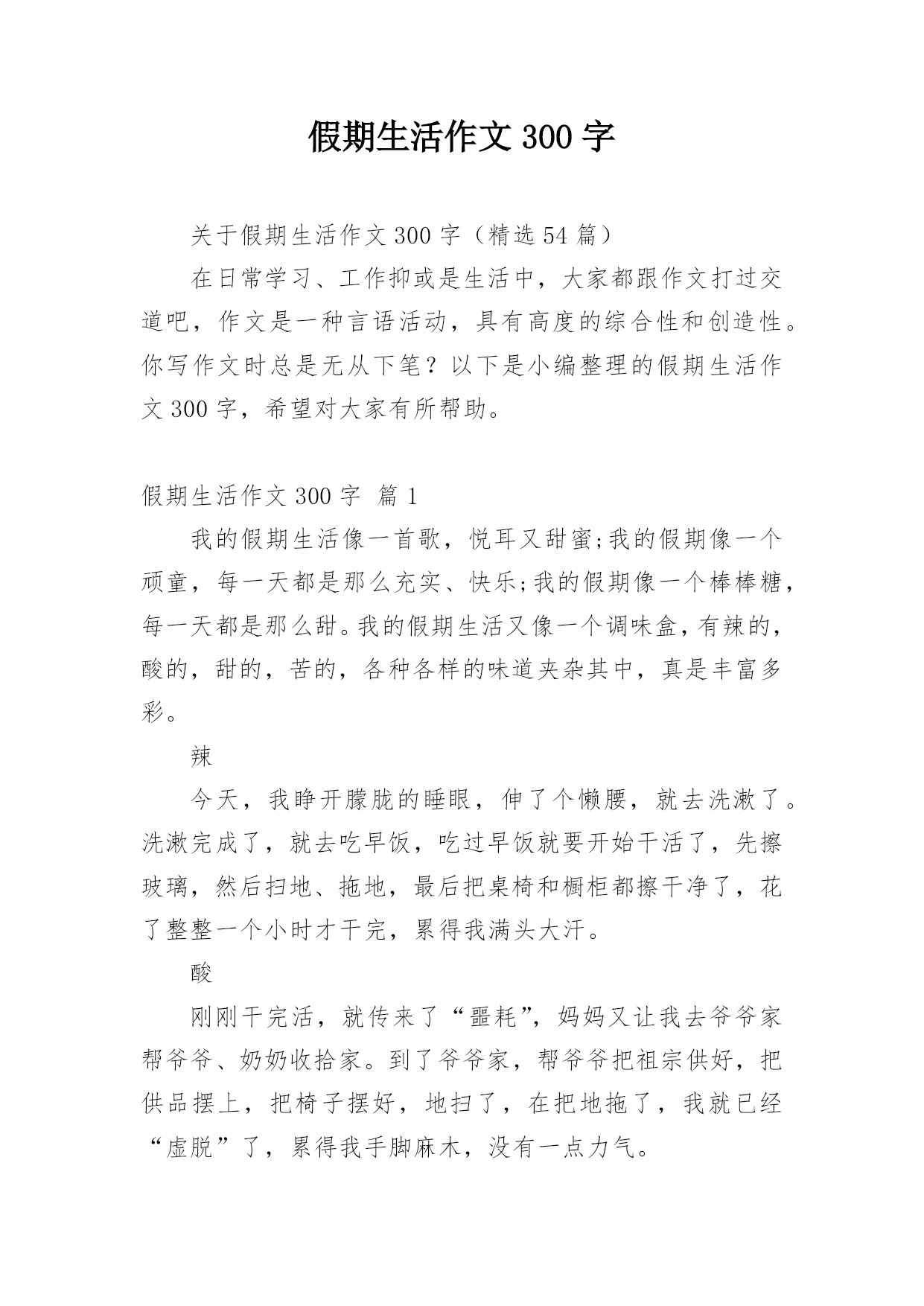 假期生活作文300字关于假期生活作文300字(精选54篇)在日常学习、工作抑或是生活中,大家都跟作文打过交道吧,作文是一种言语活动,具有高度的综合性和创造性。你写作文时总是无从下笔?以下是小编整理的假期生活作文300字,希望对大家有所帮助。假期生活作文300字篇1我的假期生活像一首歌,悦耳又甜蜜;我的假期像一个顽童,每一天都是那么充实、快乐;我的假期像一个棒棒糖,每一天都是那么甜。我的假期生活又像一个调味盒,有辣的,酸的,甜的,苦的,各种各样的味道夹杂其中,真是丰富多彩。辣今天,我睁开朦胧的睡眼,伸了个懒