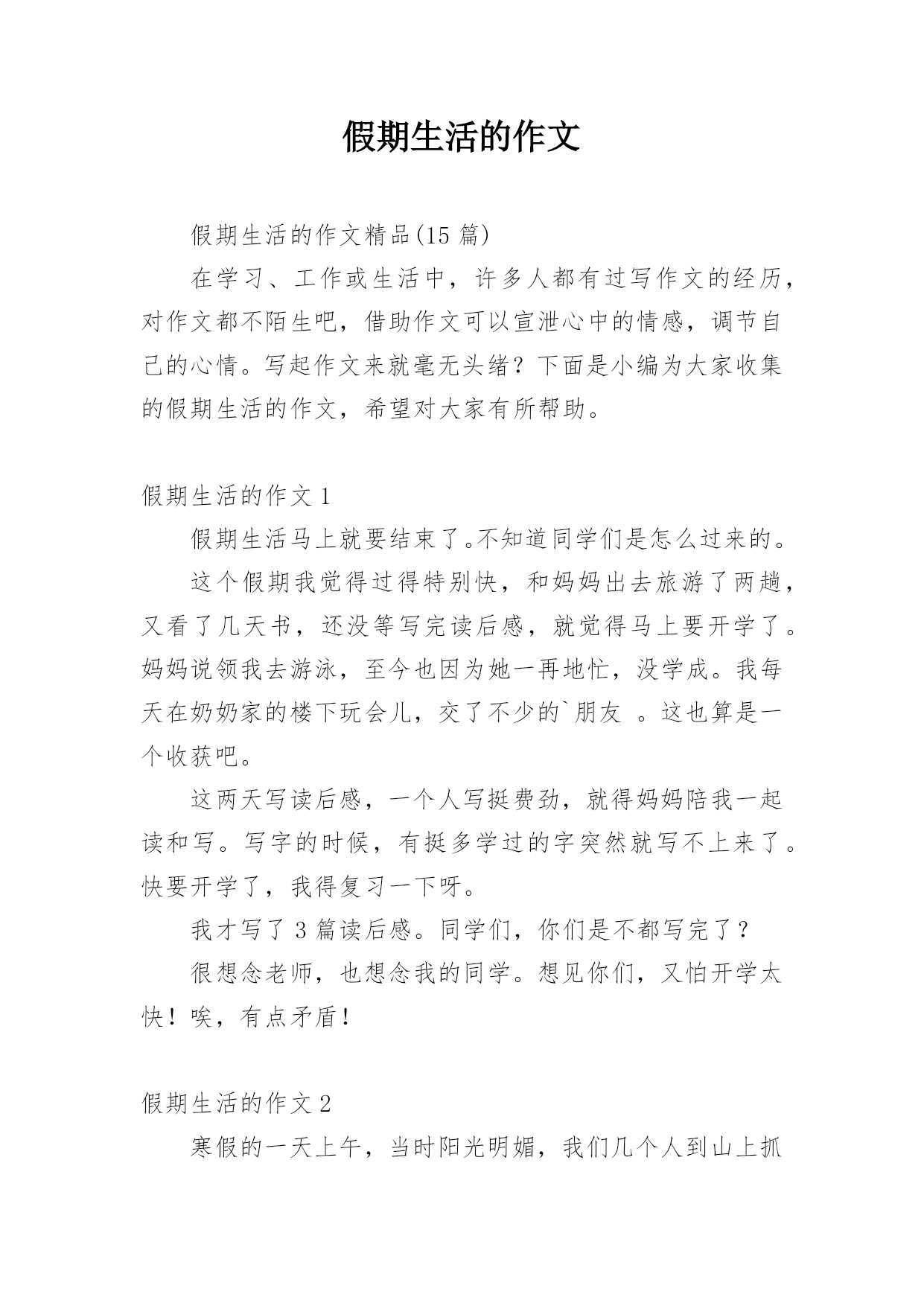 假期生活的作文假期生活的作文精品(15篇)在学习、工作或生活中,许多人都有过写作文的经历,对作文都不陌生吧,借助作文可以宣泄心中的情感,调节自己的心情。写起作文来就毫无头绪?下面是小编为大家收集的假期生活的作文,希望对大家有所帮助。假期生活的作文1假期生活马上就要结束了。不知道同学们是怎么过来的。这个假期我觉得过得特别快,和妈妈出去旅游了两趟,又看了几天书,还没等写完读后感,就觉得马上要开学了。妈妈说领我去游泳,至今也因为她一再地忙,没学成。我每天在奶奶家的楼下玩会儿,交了不少的`朋友。这也算是一个收获吧
