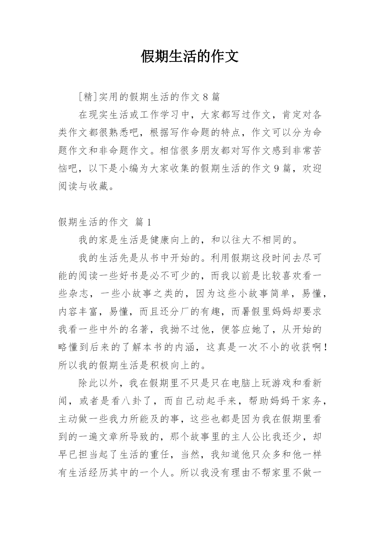 假期生活的作文[精]实用的假期生活的作文8篇在现实生活或工作学习中,大家都写过作文,肯定对各类作文都很熟悉吧,根据写作命题的特点,作文可以分为命题作文和非命题作文。相信很多朋友都对写作文感到非常苦恼吧,以下是小编为大家收集的假期生活的作文9篇,欢迎阅读与收藏。假期生活的作文篇1我的家是生活是健康向上的,和以往大不相同的。我的生活先是从书中开始的。利用假期这段时间去尽可能的阅读一些好书是必不可少的,而我以前是比较喜欢看一些杂志,一些小故事之类的,因为这些小故事简单,易懂,内容丰富,易懂,而且还分厂的有趣,而