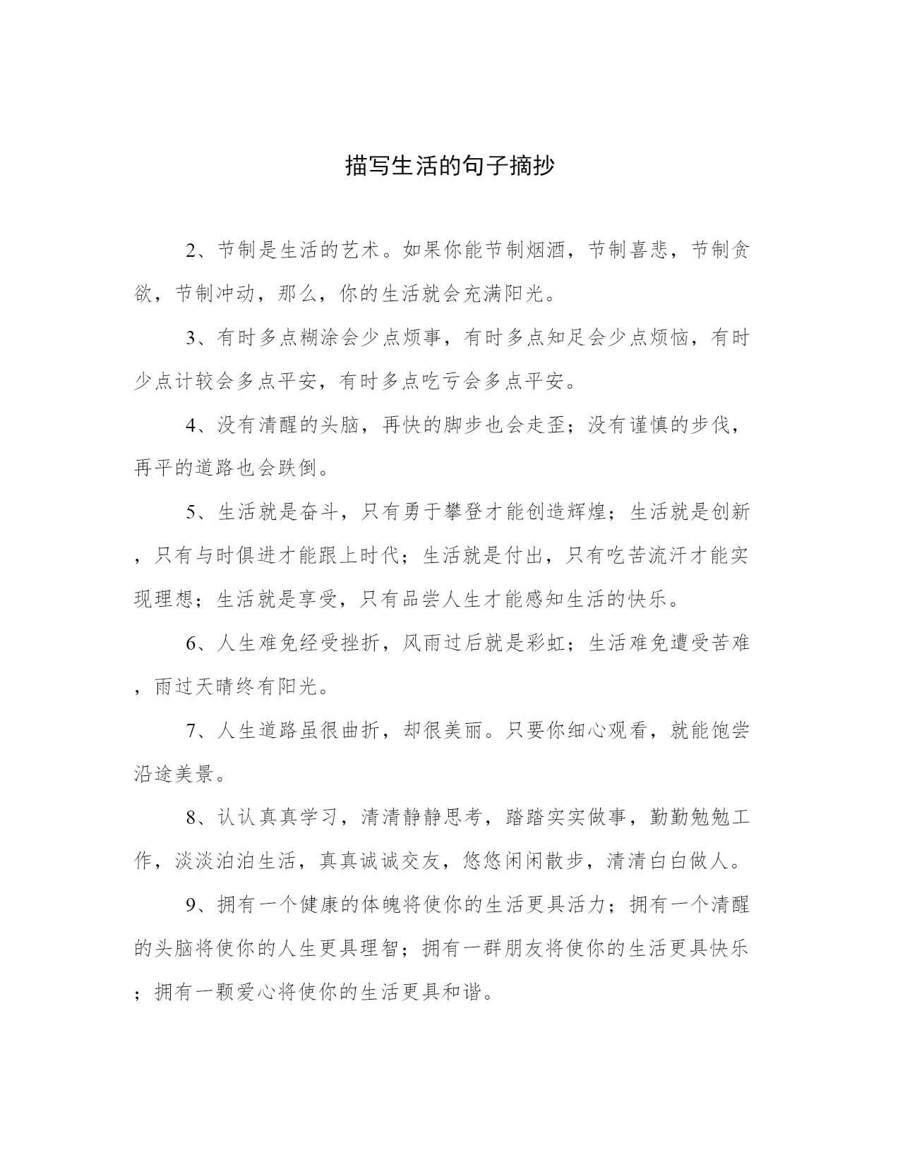描写生活的句子摘抄2、节制是生活的艺术。如果你能节制烟酒,节制喜悲,节制贪欲,节制冲动,那么,你的生活就会充满阳光。3、有时多点糊涂会少点烦事,有时多点知足会少点烦恼,有时少点计较会多点平安,有时多点吃亏会多点平安。4、没有清醒的头脑,再快的脚步也会走歪;没有谨慎的步伐,再平的道路也会跌倒。5、生活就是奋斗,只有勇于攀登才能创造辉煌;生活就是创新,只有与时俱进才能跟上时代;生活就是付出,只有吃苦流汗才能实现理想;生活就是享受,只有品尝人生才能感知生活的快乐。6、人生难免经受挫折,风雨过后就是彩虹;生活难免