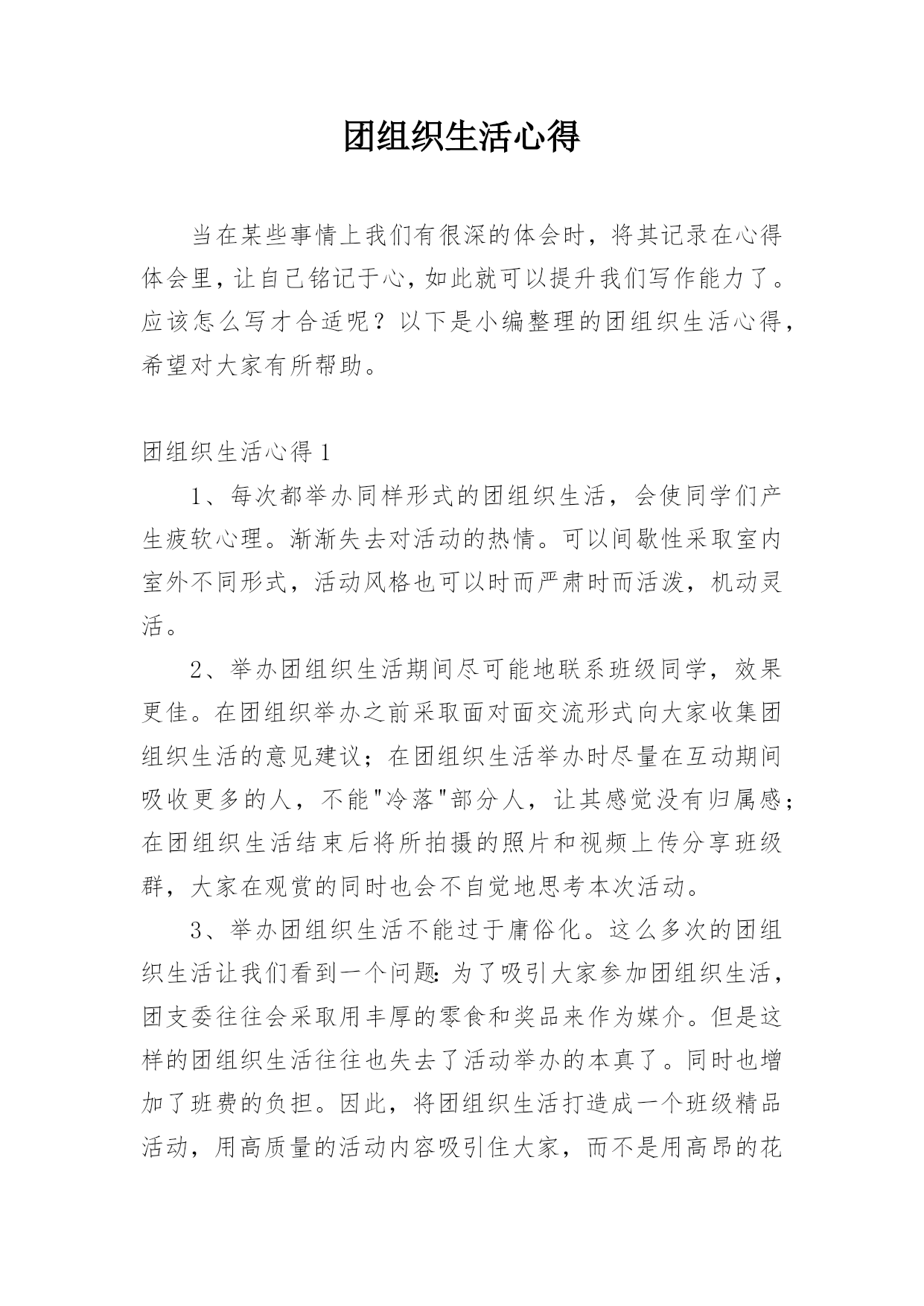 团组织生活心得当在某些事情上我们有很深的体会时,将其记录在心得体会里,让自己铭记于心,如此就可以提升我们写作能力了。应该怎么写才合适呢?以下是小编整理的团组织生活心得,希望对大家有所帮助。团组织生活心得11、每次都举办同样形式的团组织生活,会使同学们产生疲软心理。渐渐失去对活动的热情。可以间歇性采取室内室外不同形式,活动风格也可以时而严肃时而活泼,机动灵活。2、举办团组织生活期间尽可能地联系班级同学,效果更佳。在团组织举办之前采取面对面交流形式向大家收集团组织生活的意见建议;在团组织生活举办时尽量在互动期